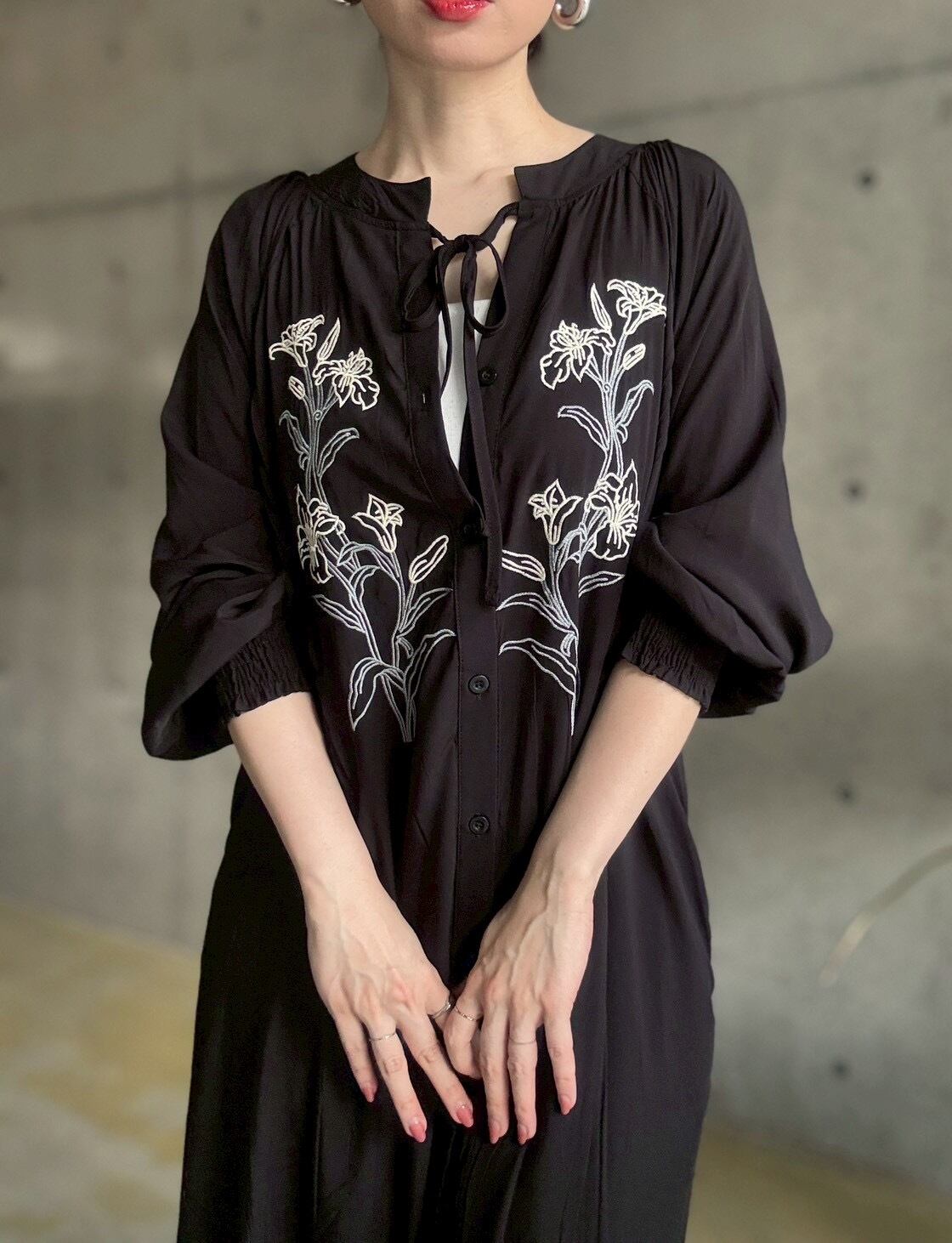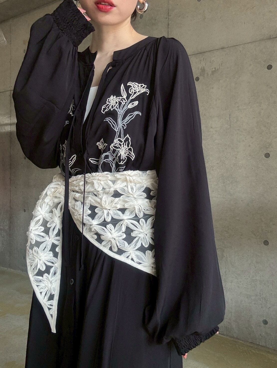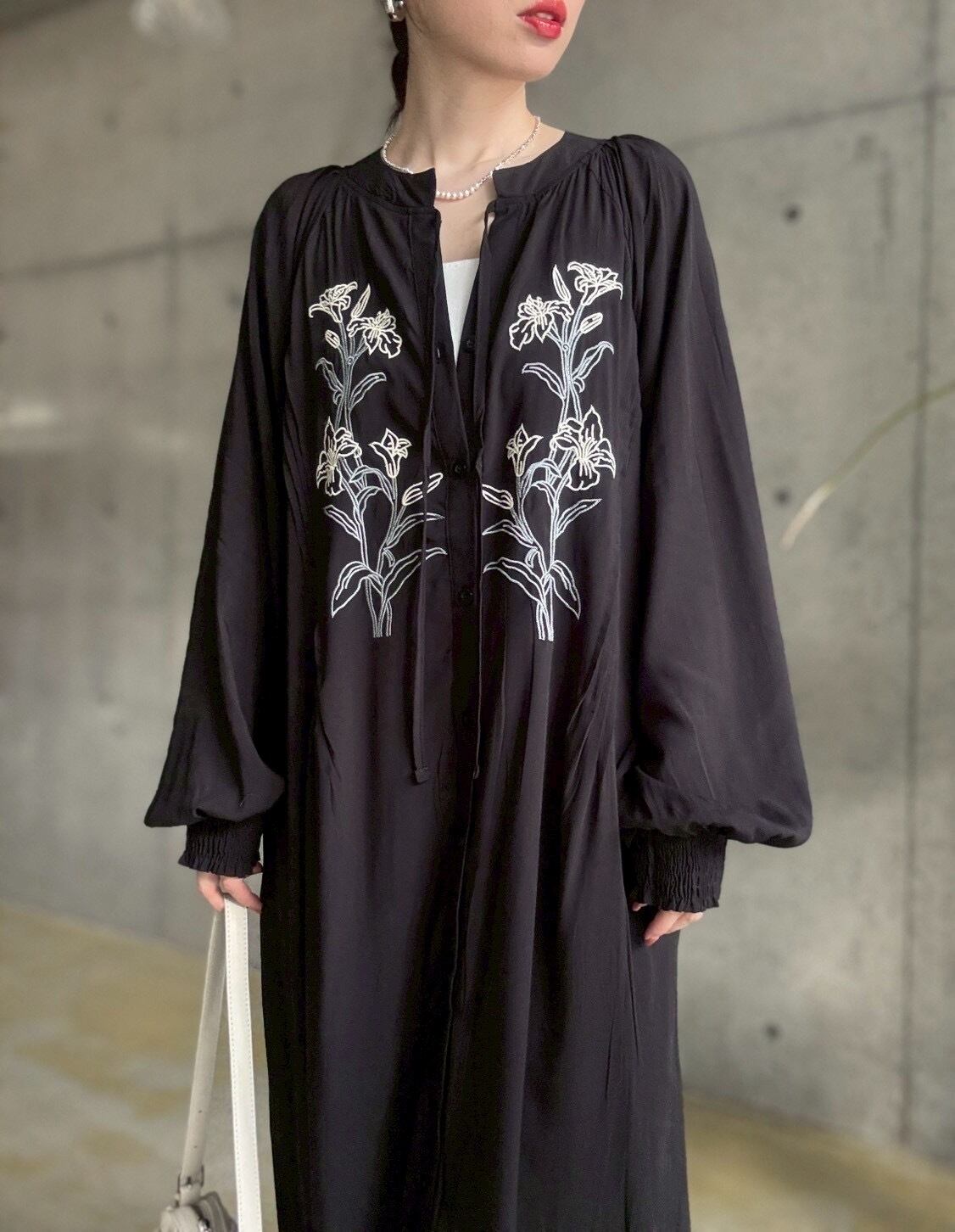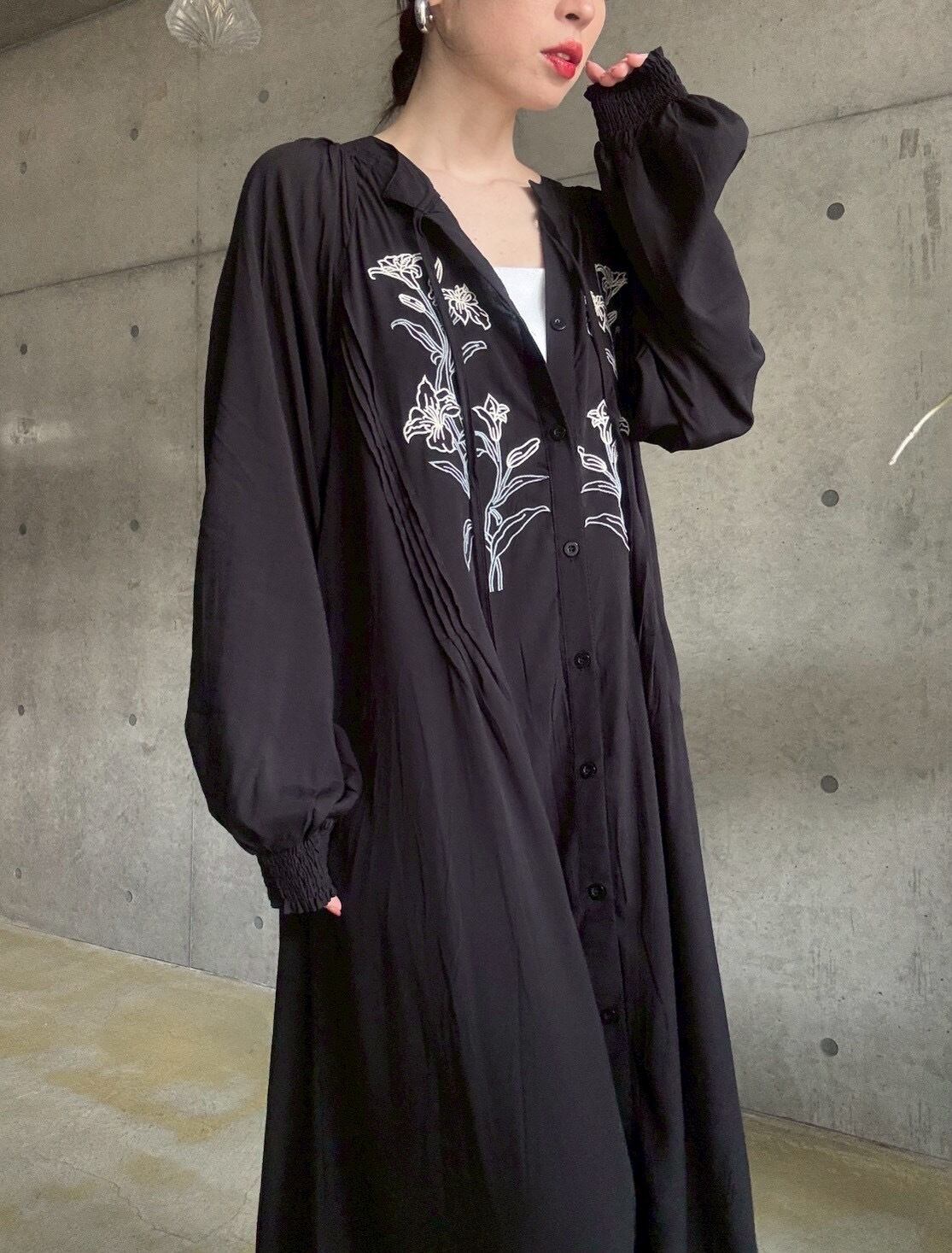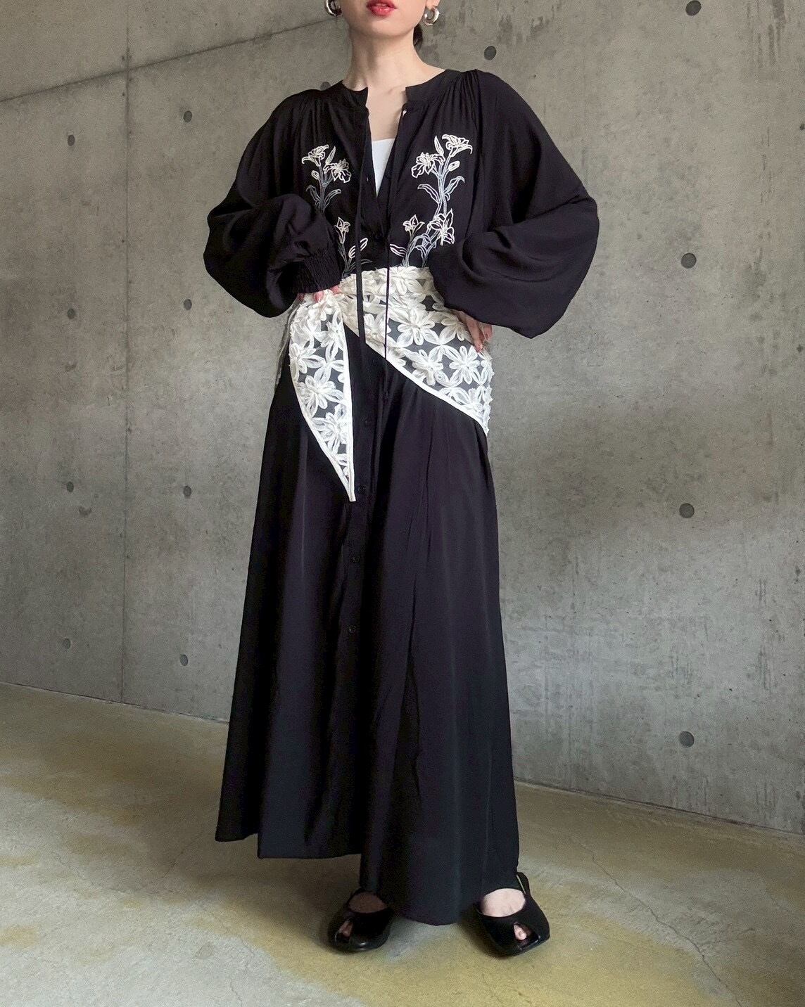 【4/11 21:00〜】フラワー刺繍前あきロングワンピース【ブラック】