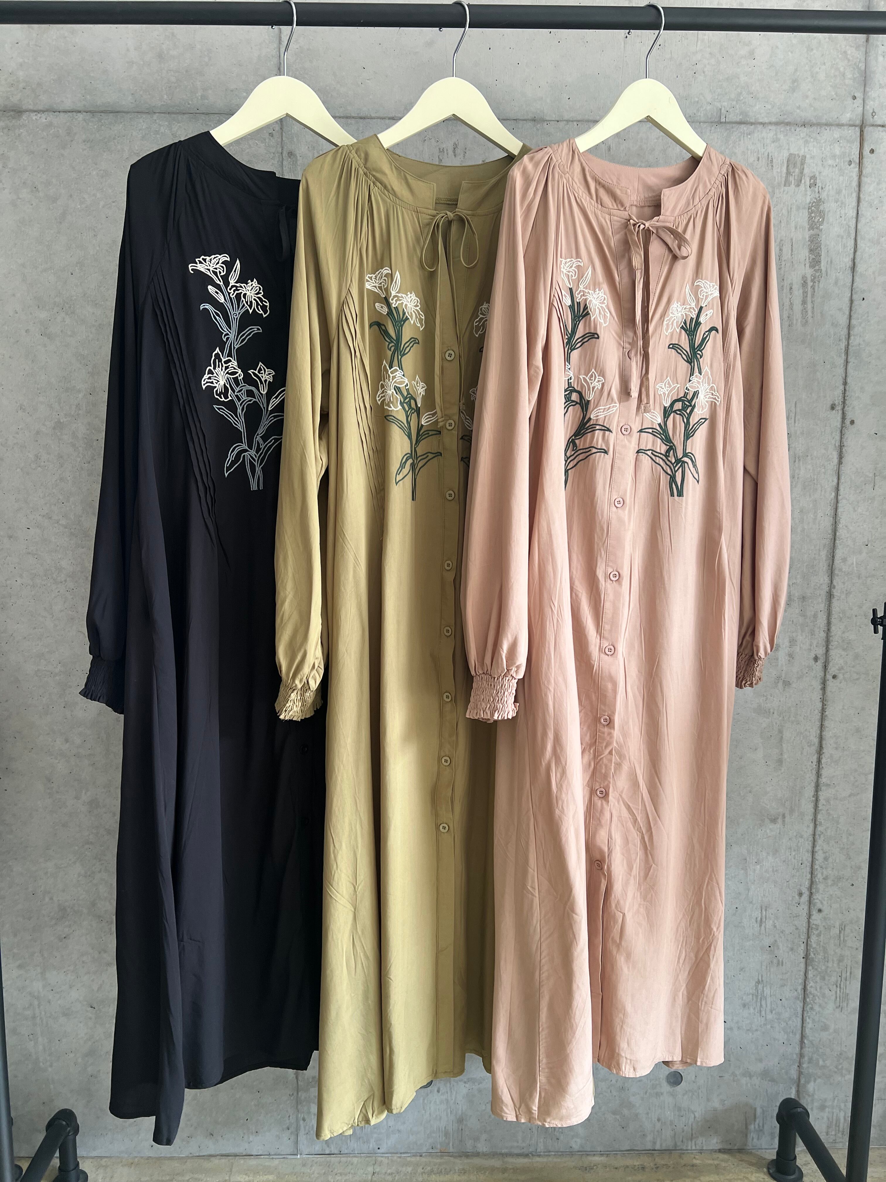 フラワー刺繍がポイント♪テロっとした落ち感のある生地を使用したロングワンピース✨