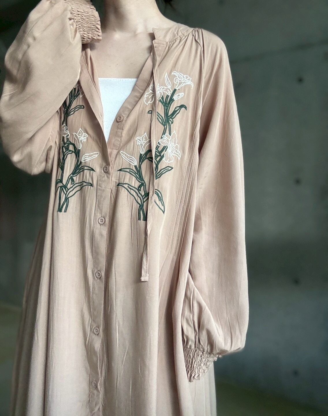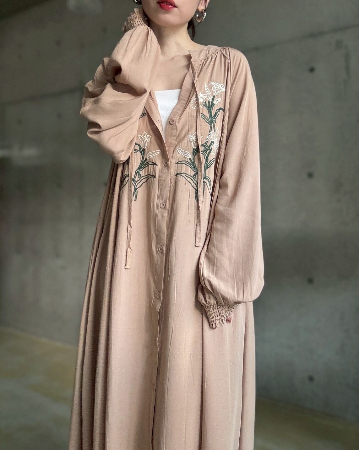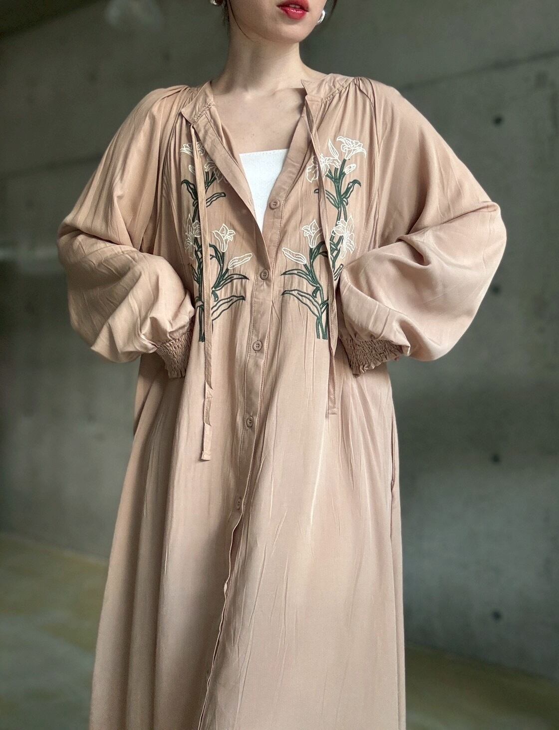 【4/11 21:00〜】フラワー刺繍前あきロングワンピース【ベージュ】