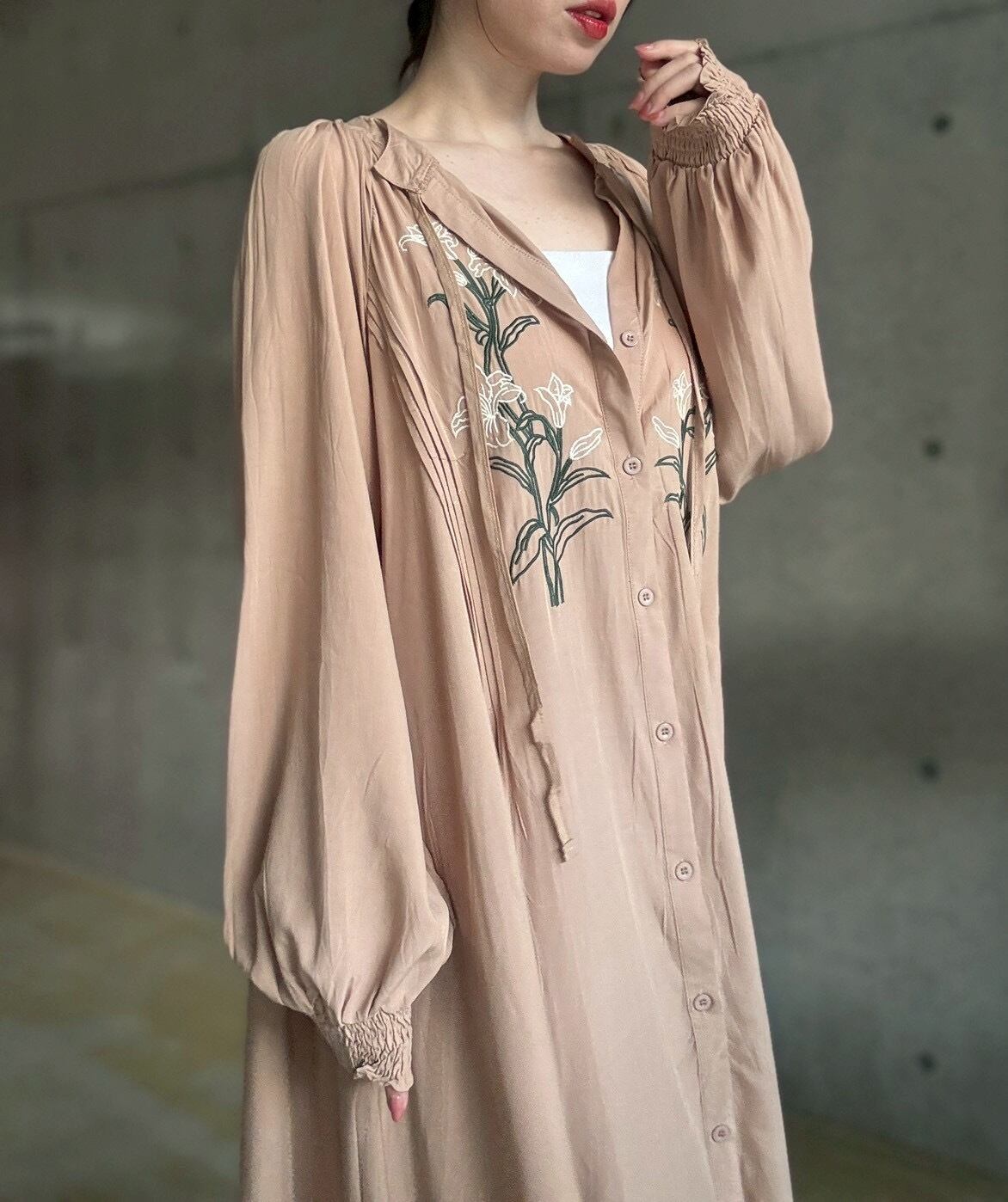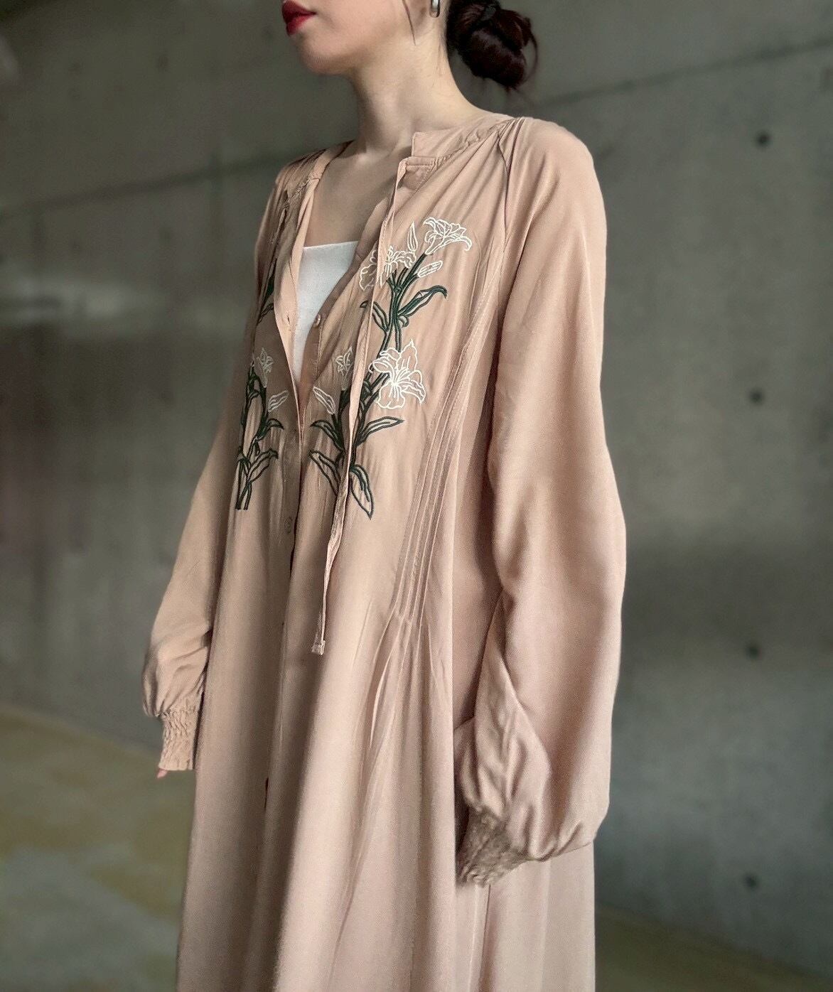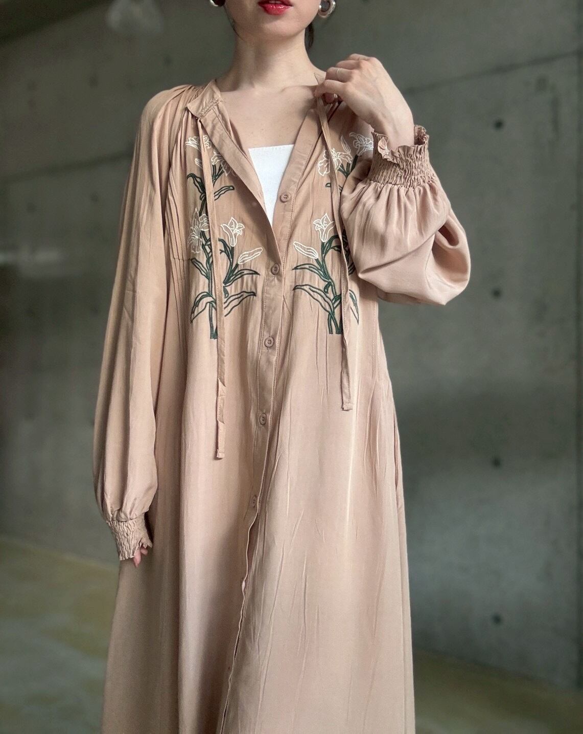 【4/11 21:00〜】フラワー刺繍前あきロングワンピース【ベージュ】