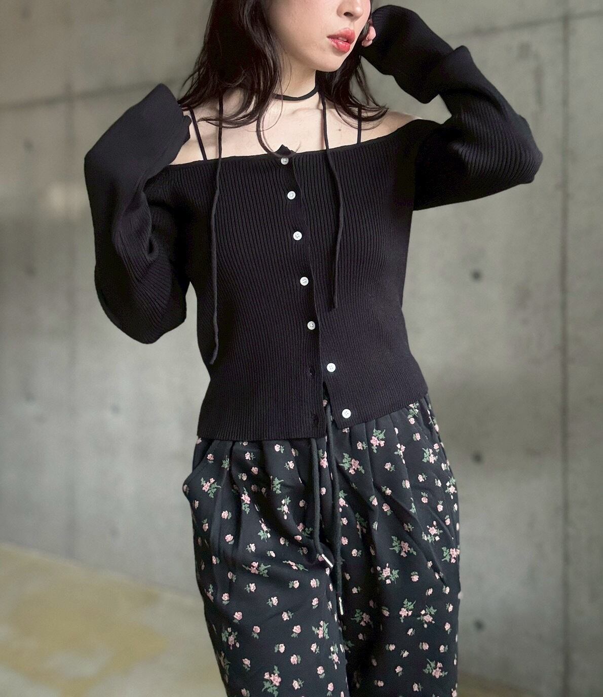 タイ付きオフショルデザインカーディガン【ブラック】