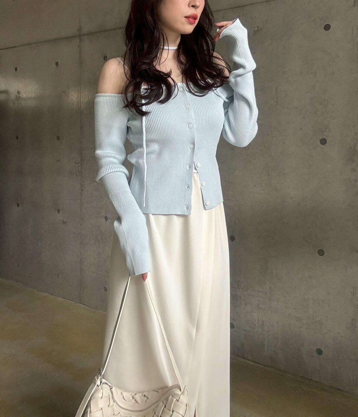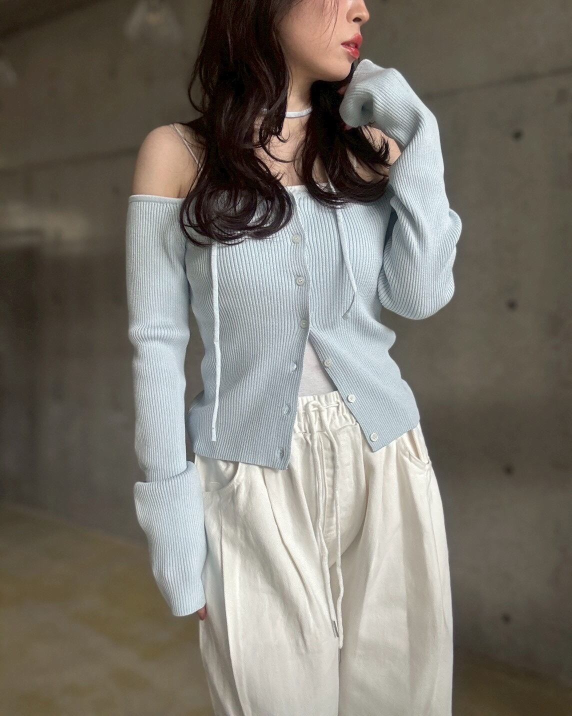 珍しいオフショルデザインで、カーディガンなのに羽織っぽくなく、女性らしいこなれ感のあるスタイリングが叶います✨