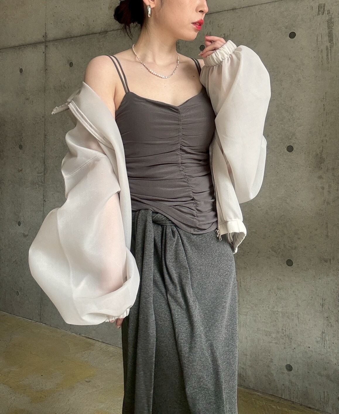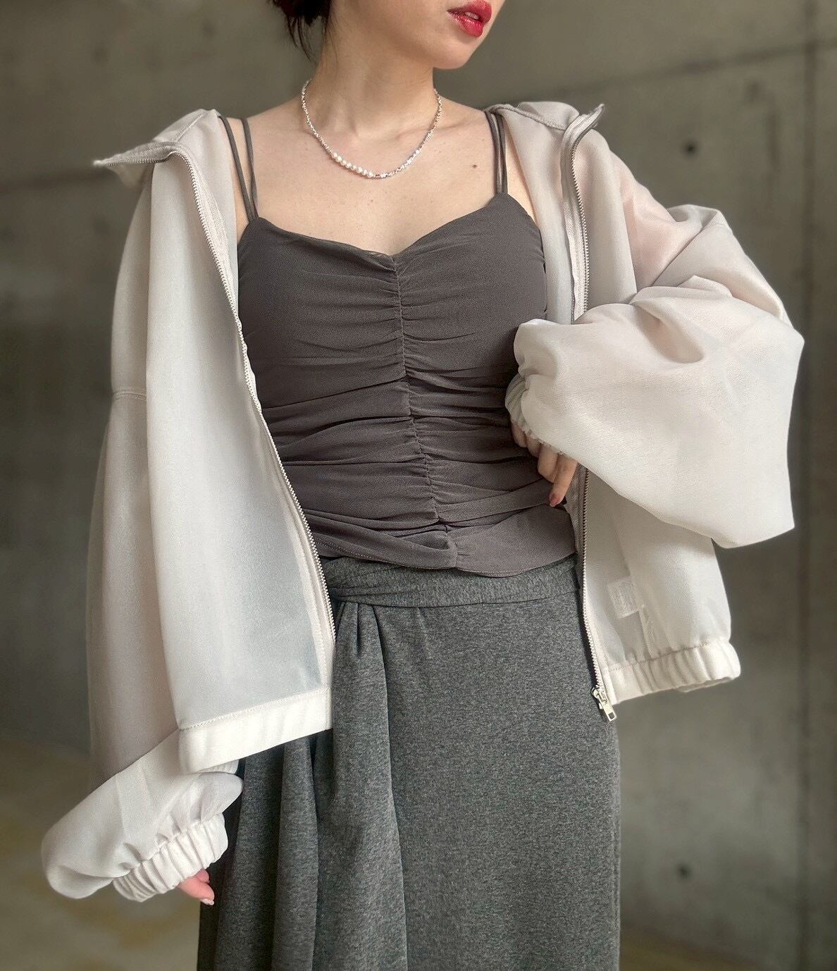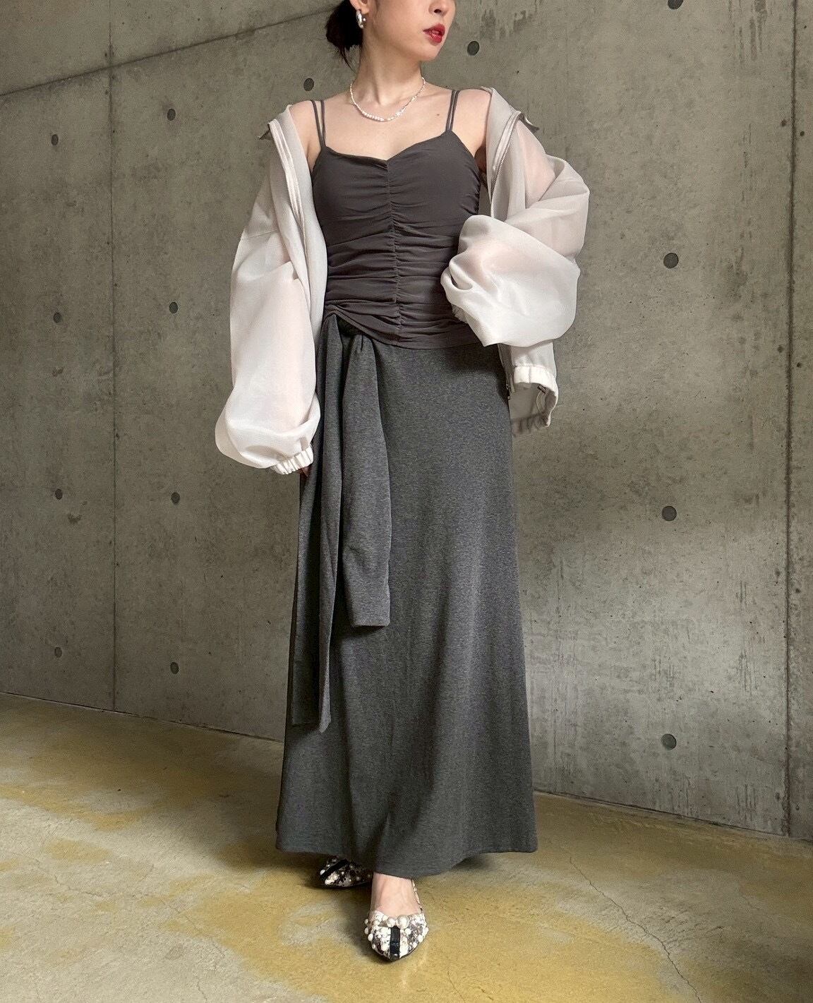 ジャケットやカーディガンのインナーに◎シャーリングの凹凸感が、マニッシュな装いに女性らしいエッセンスを添えてくれます✨