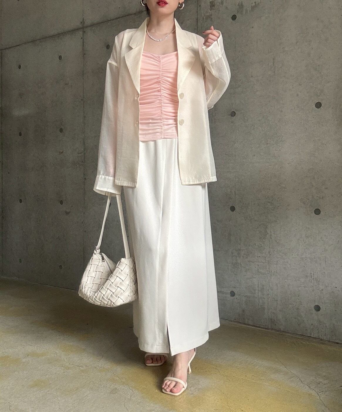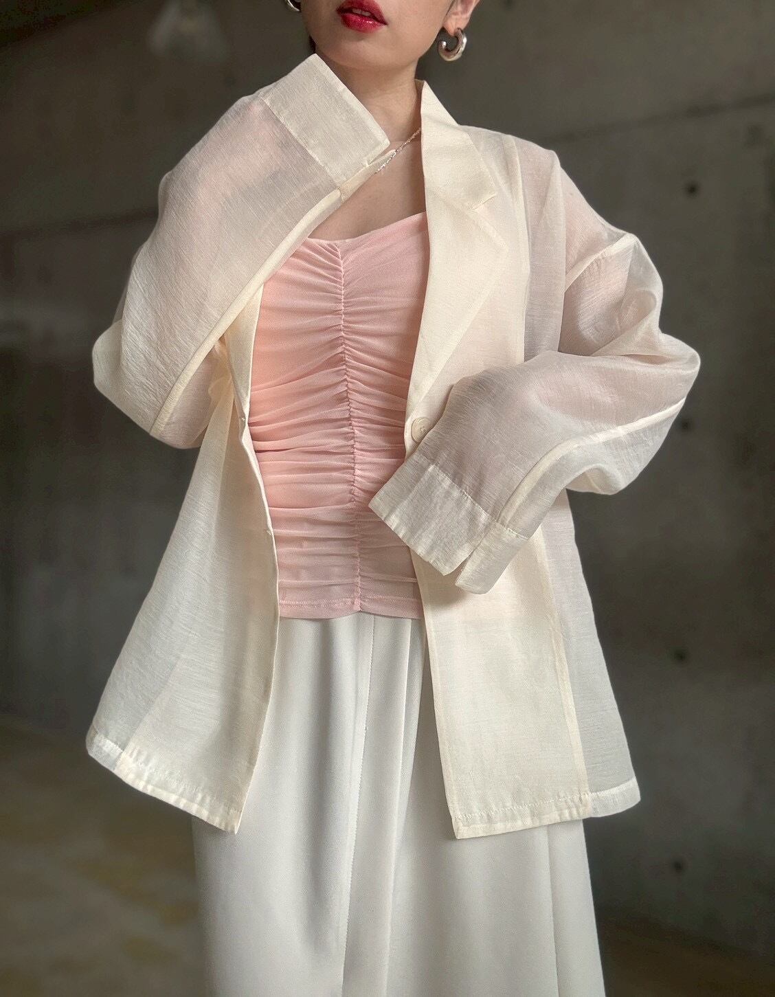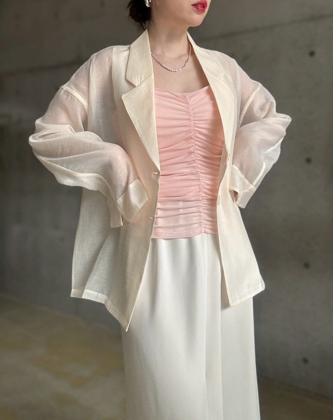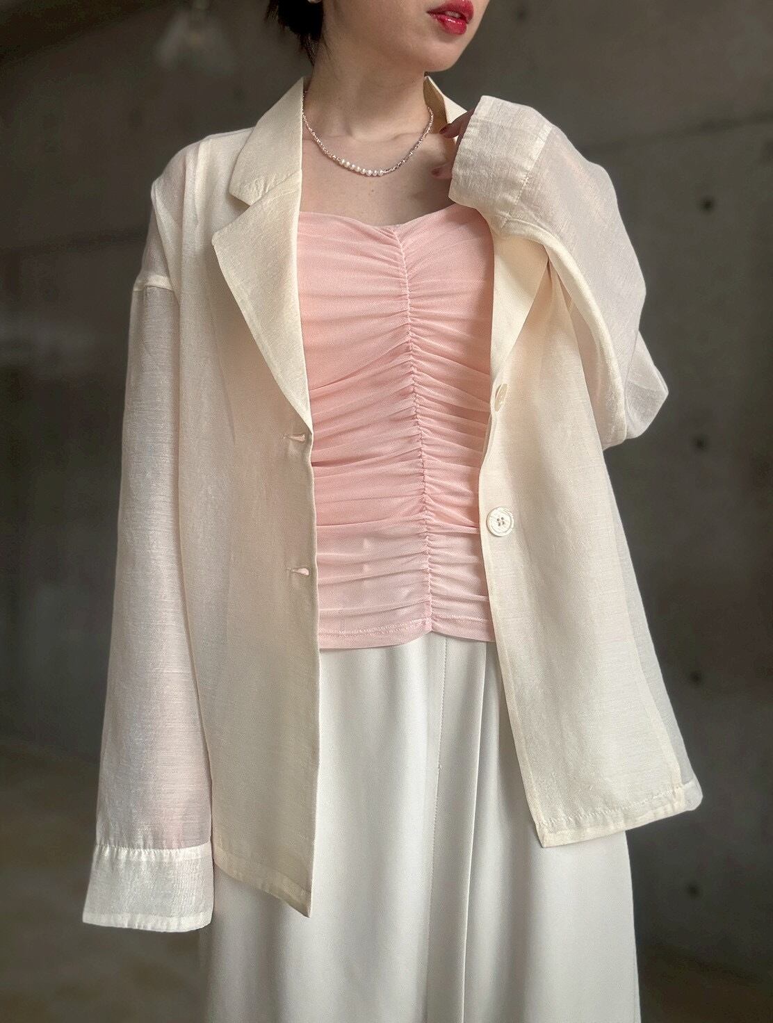 ジャケットやカーディガンのインナーに◎シャーリングの凹凸感が、マニッシュな装いに女性らしいエッセンスを添えてくれます✨