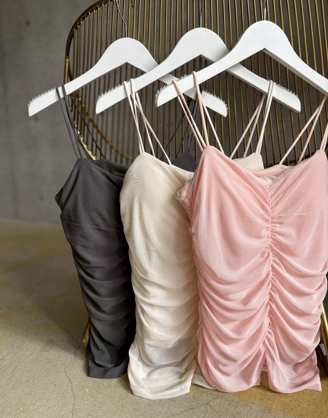 カップ付きが嬉しい♪チュール×シャーリングが柔らかな女性らしさをプラスしてくれるデザインキャミソール✨