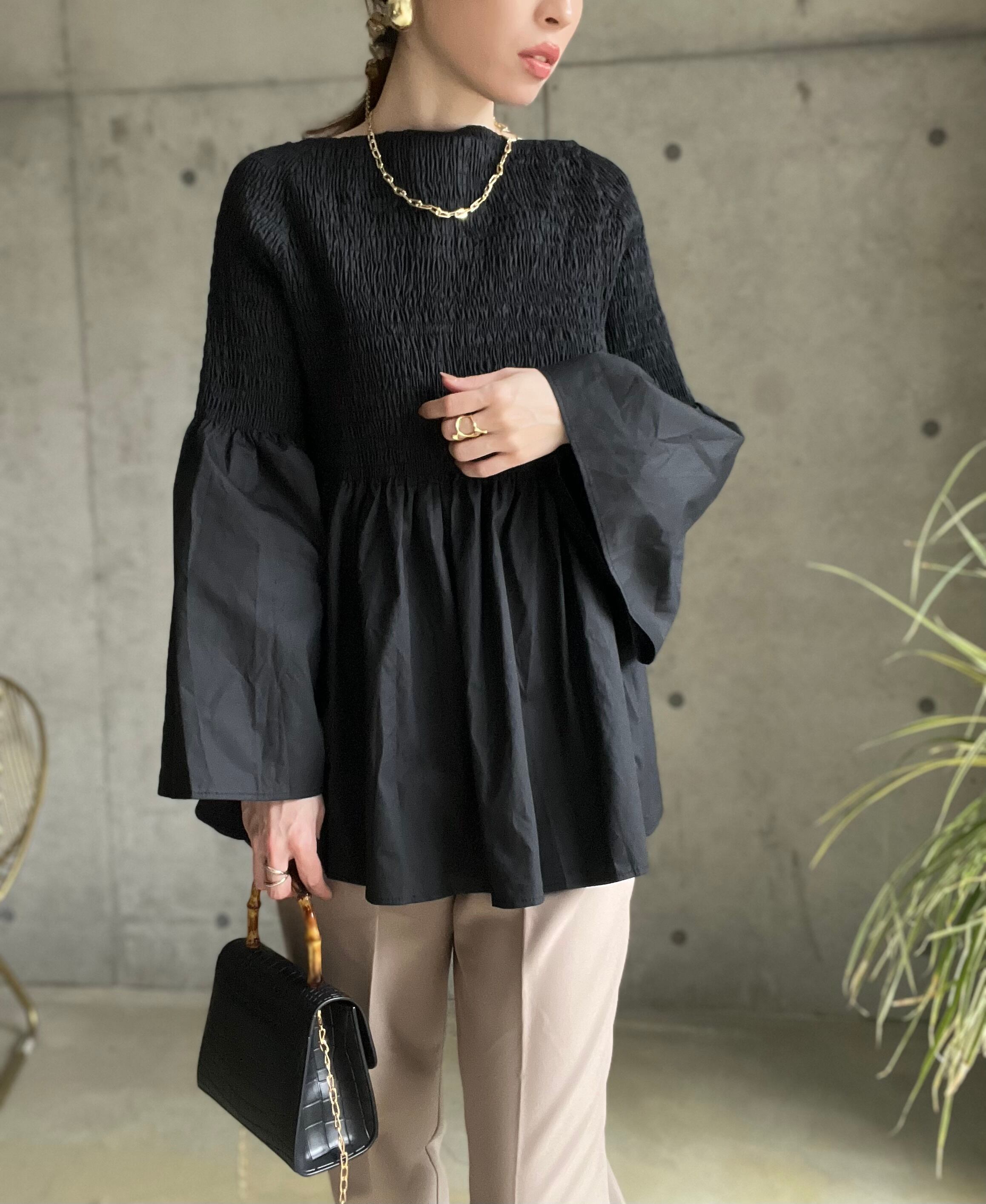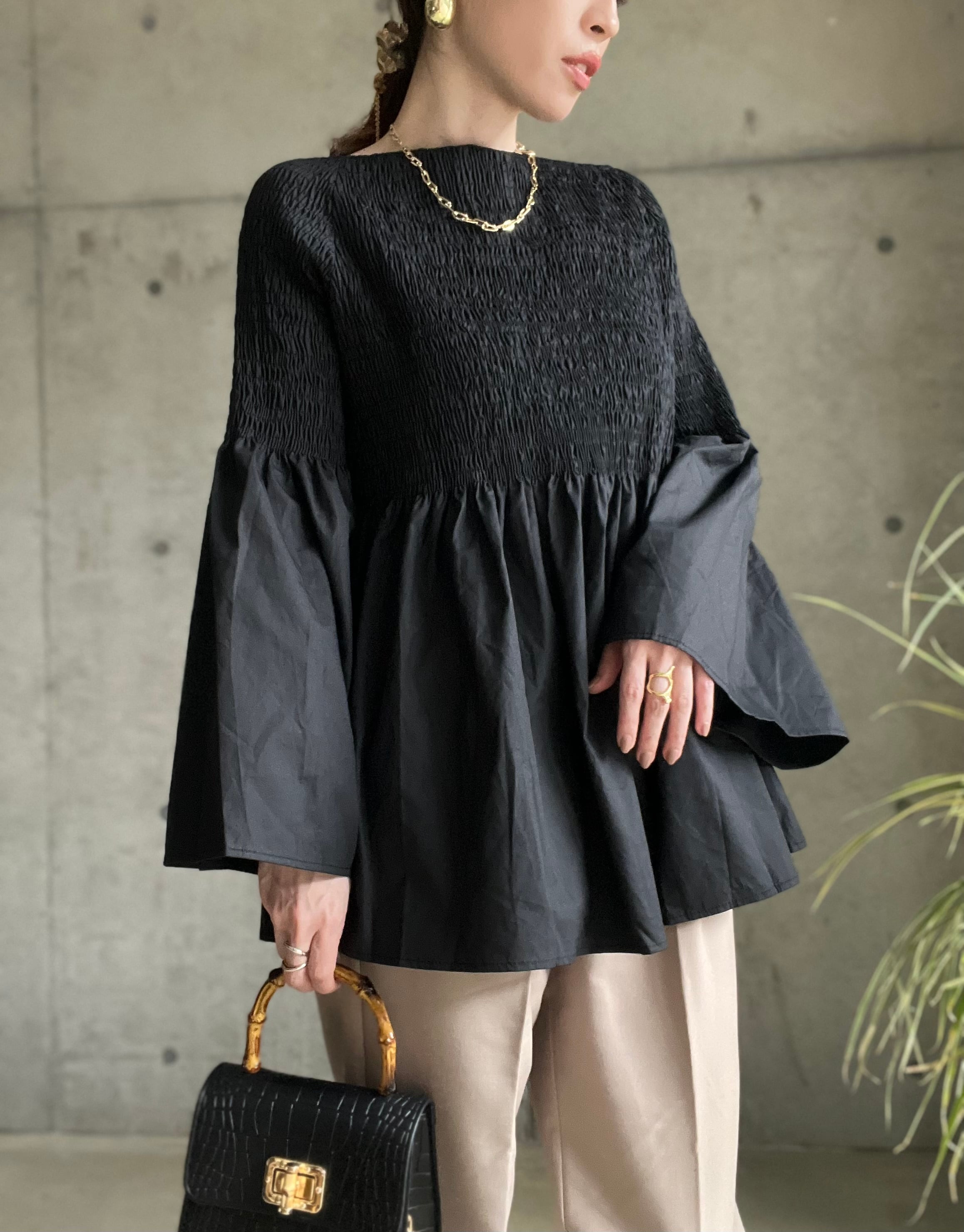 【即納】2WAYシャーリング袖フレアブラウス【ブラック】