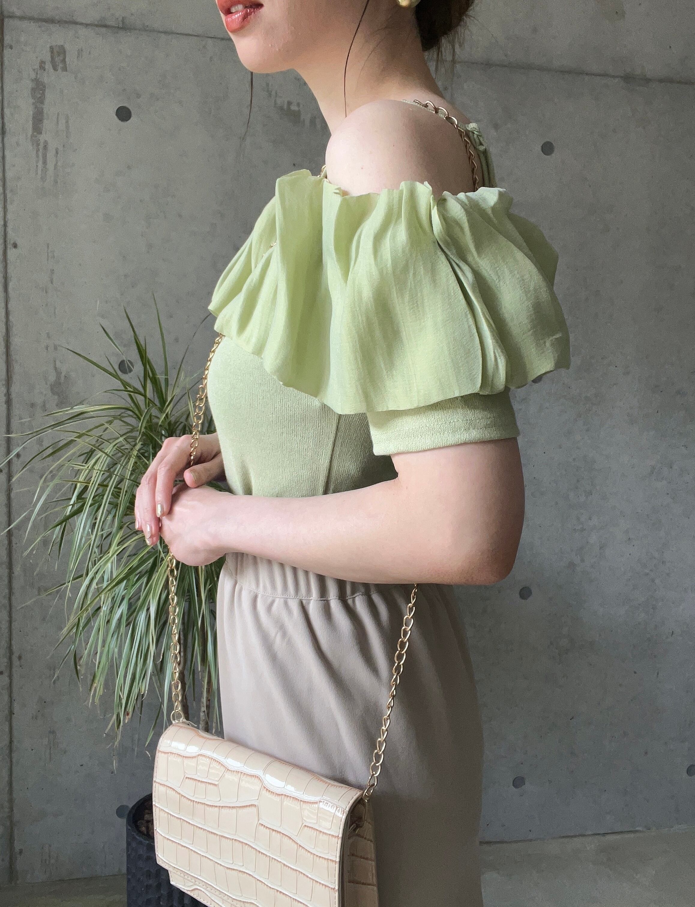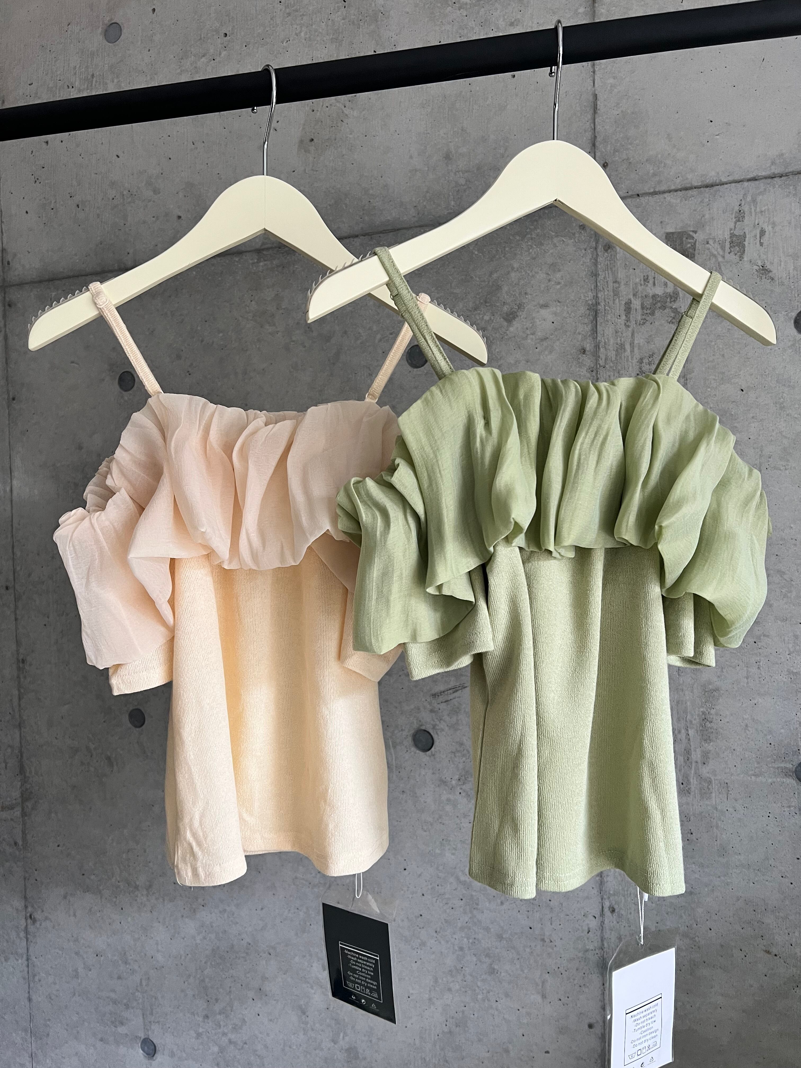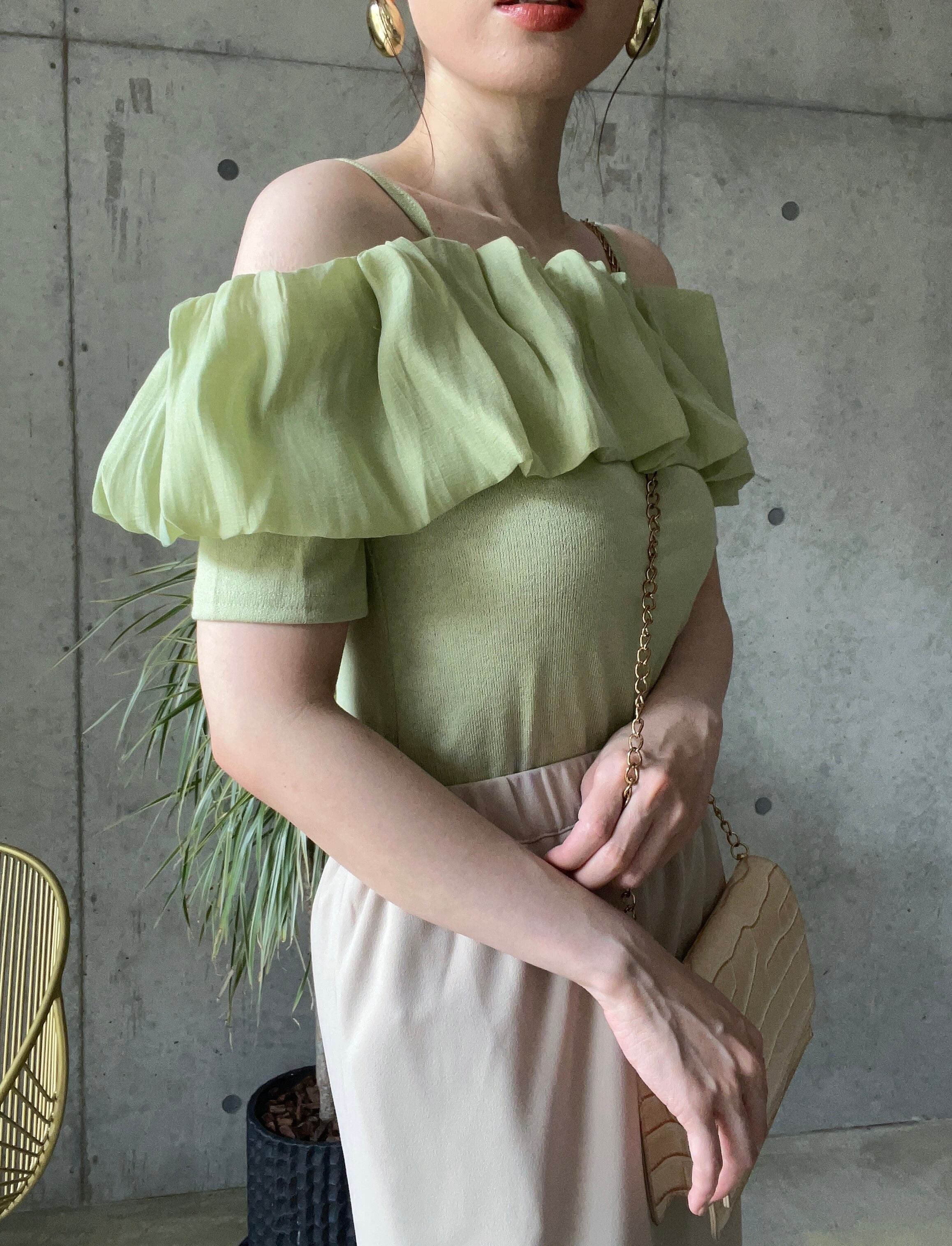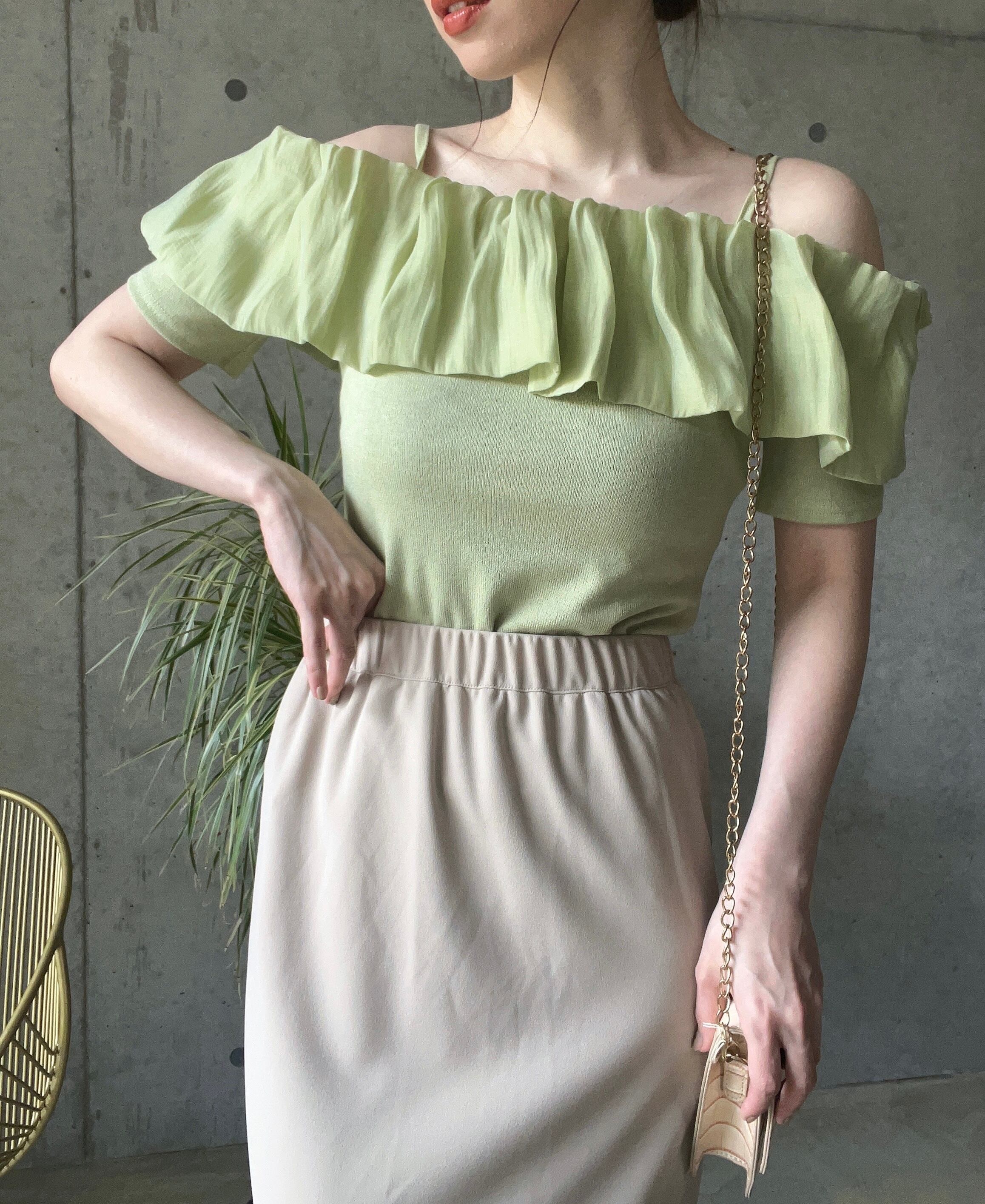 【即納】オフショルダーシフォンデザイントップス【ピスタチオ】