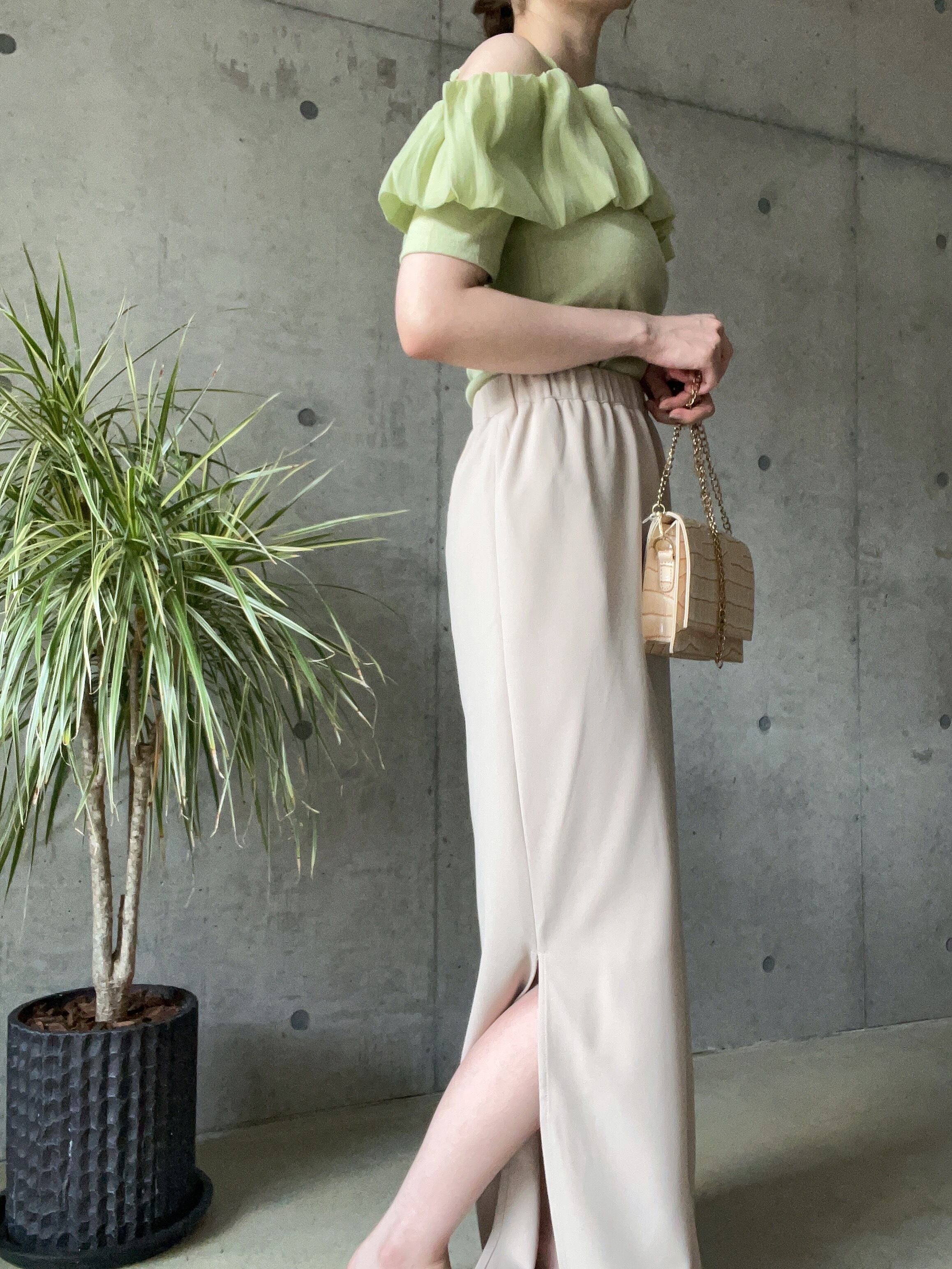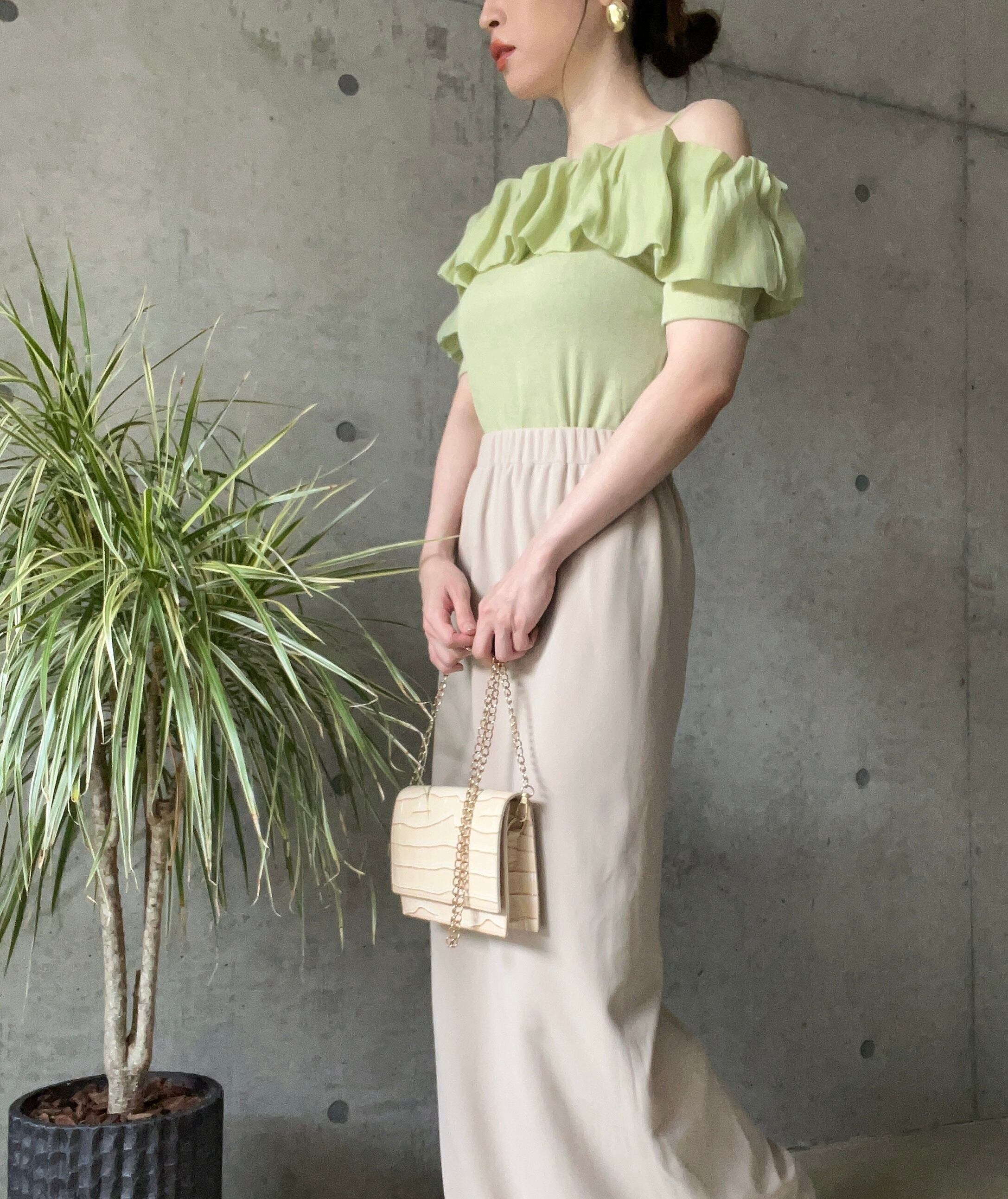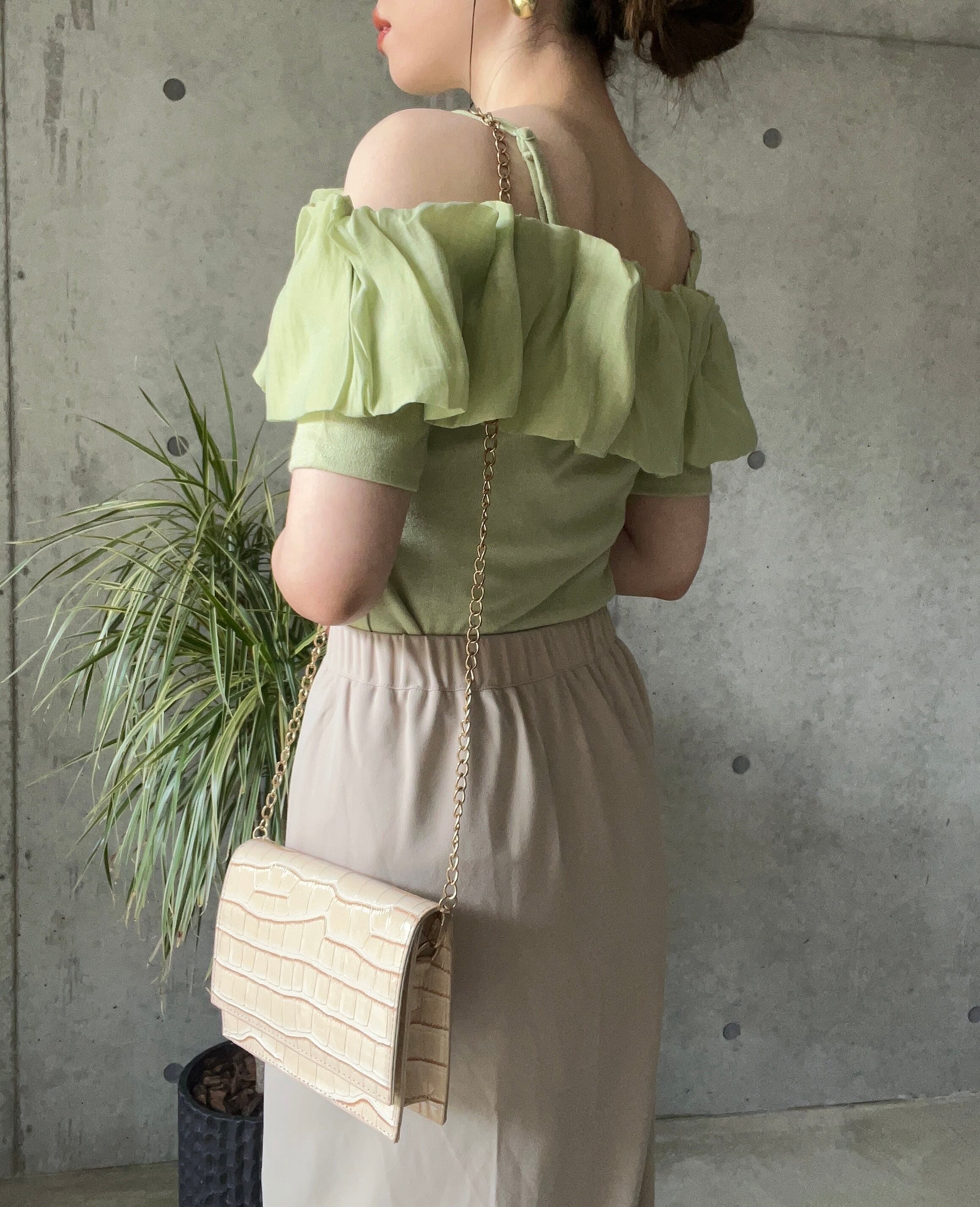 【即納】オフショルダーシフォンデザイントップス【ピスタチオ】