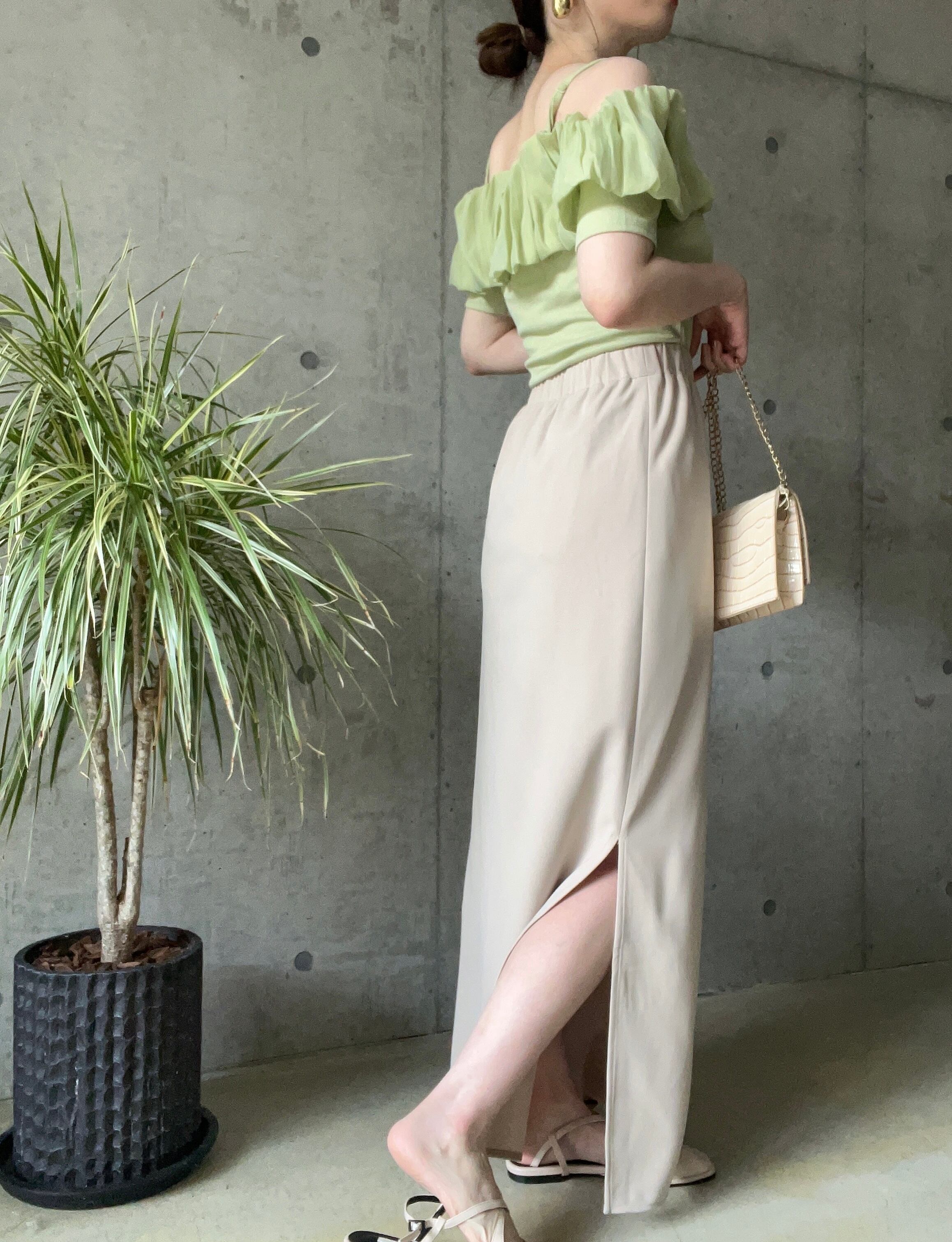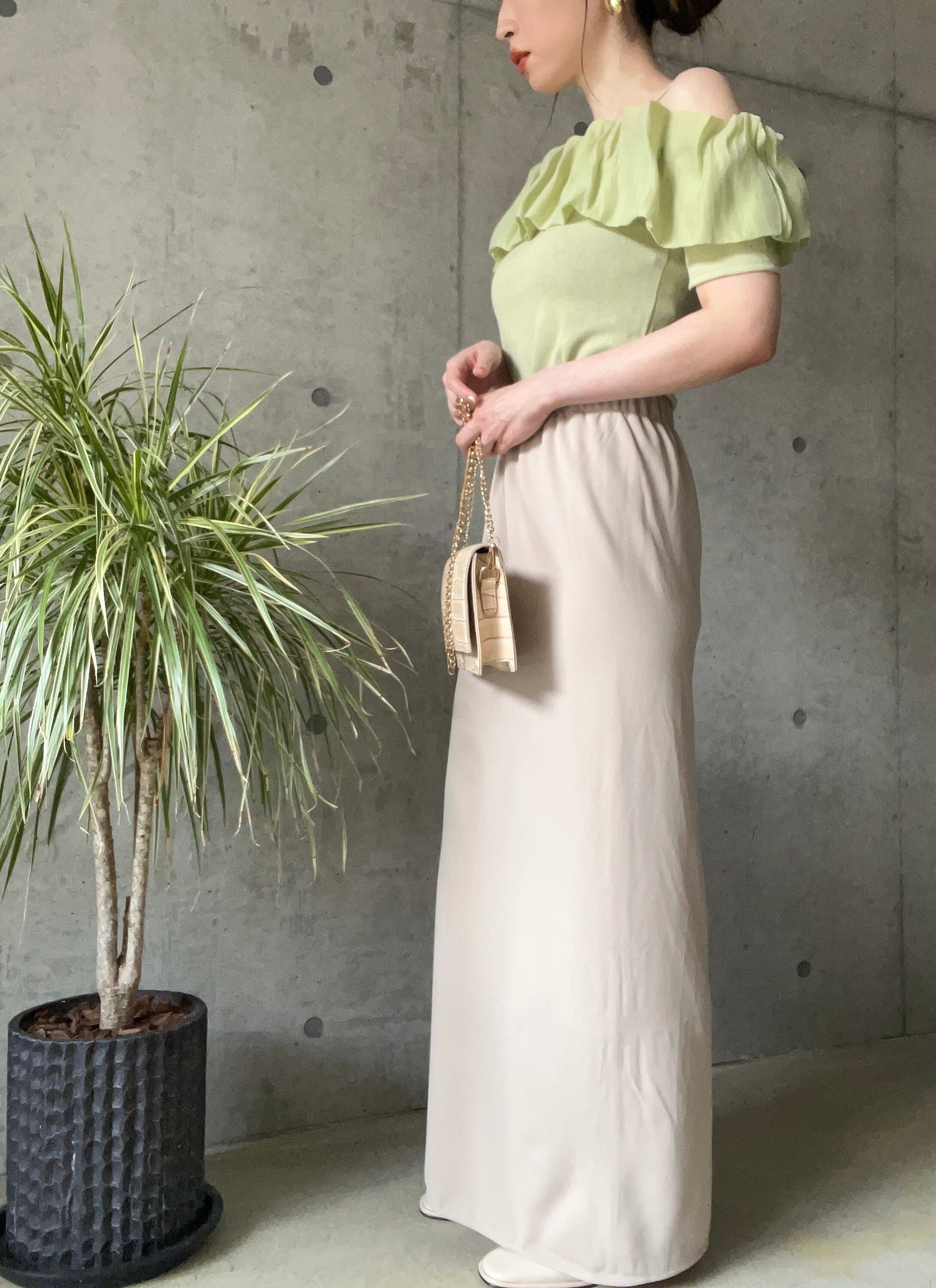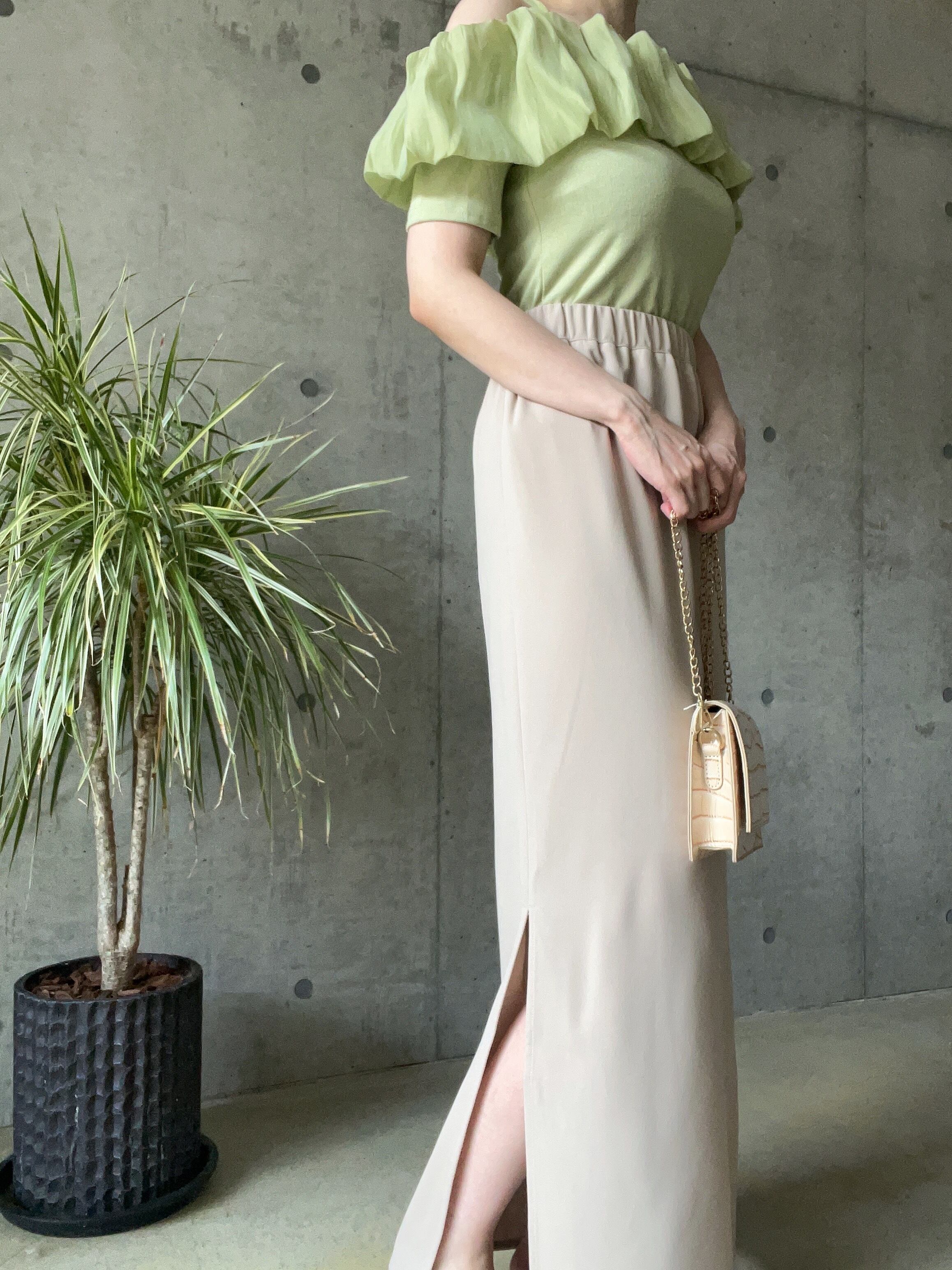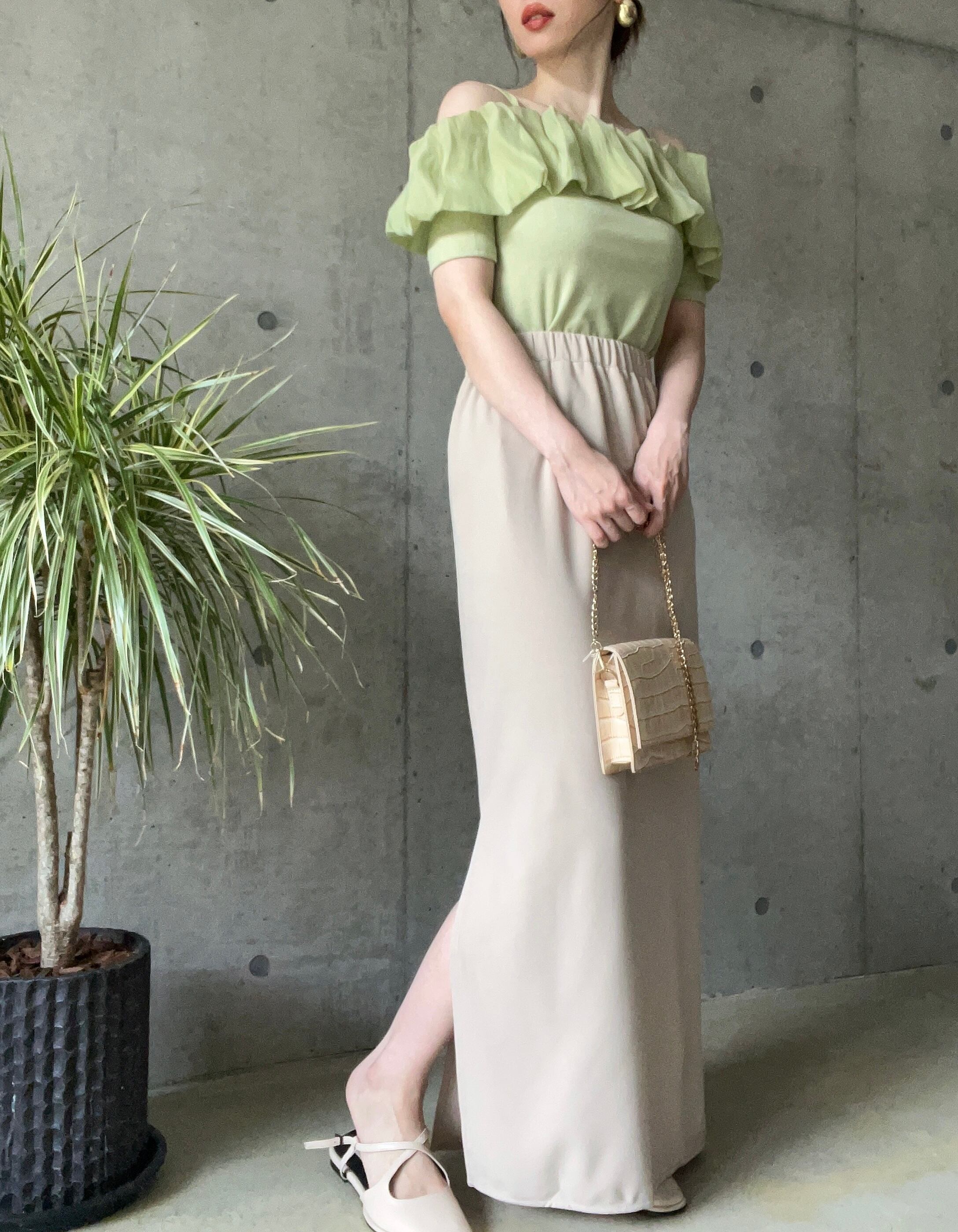 【即納】オフショルダーシフォンデザイントップス【ピスタチオ】