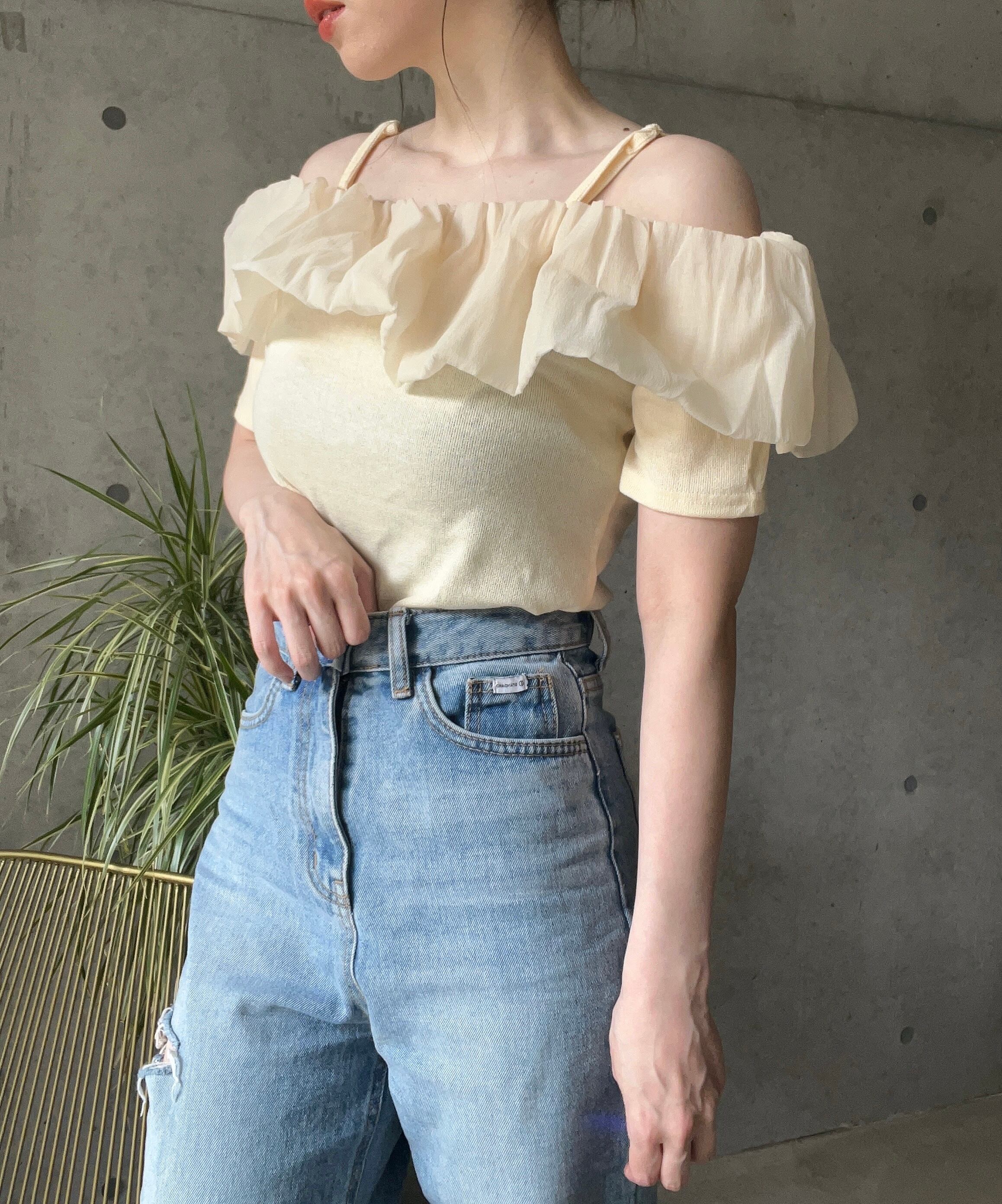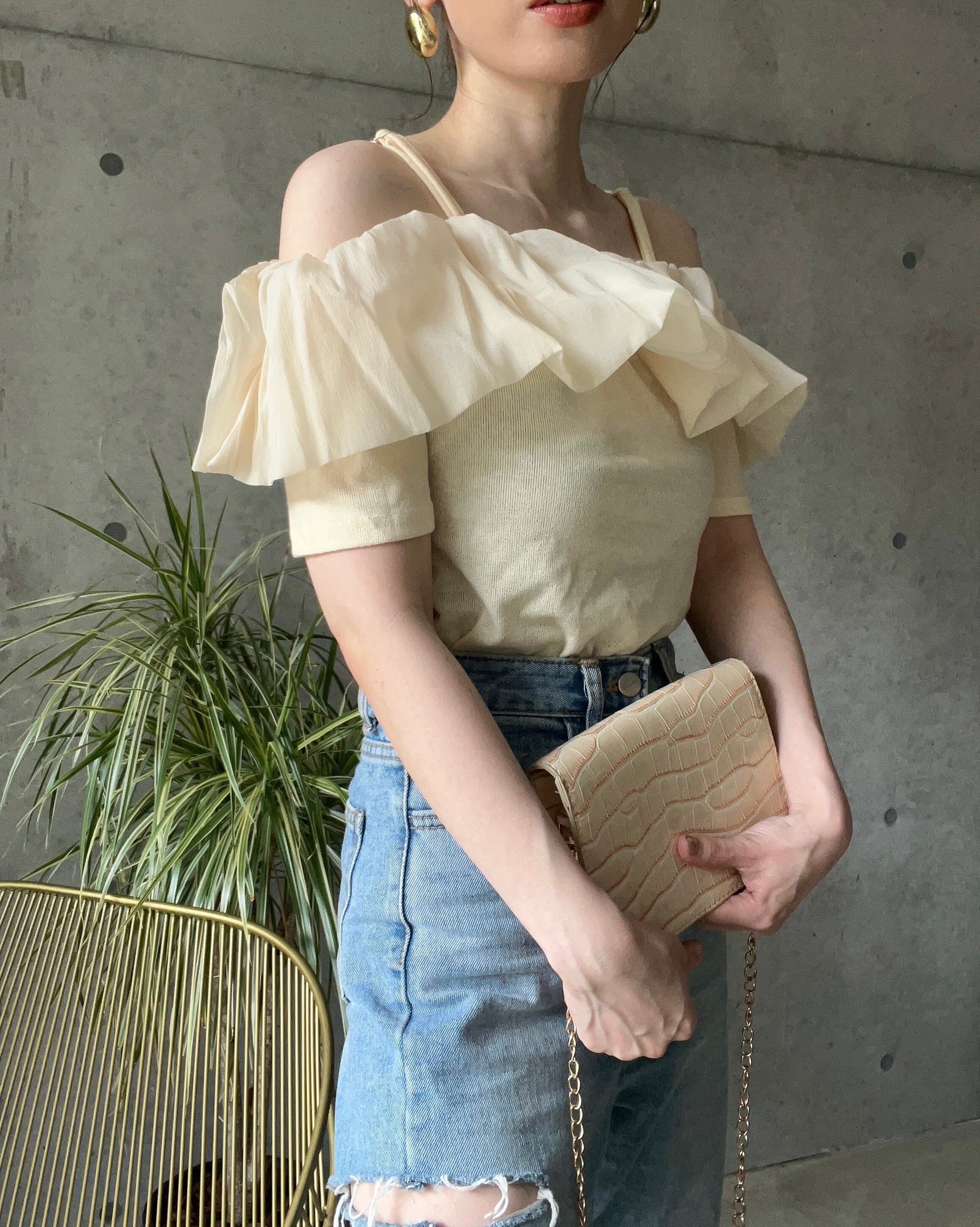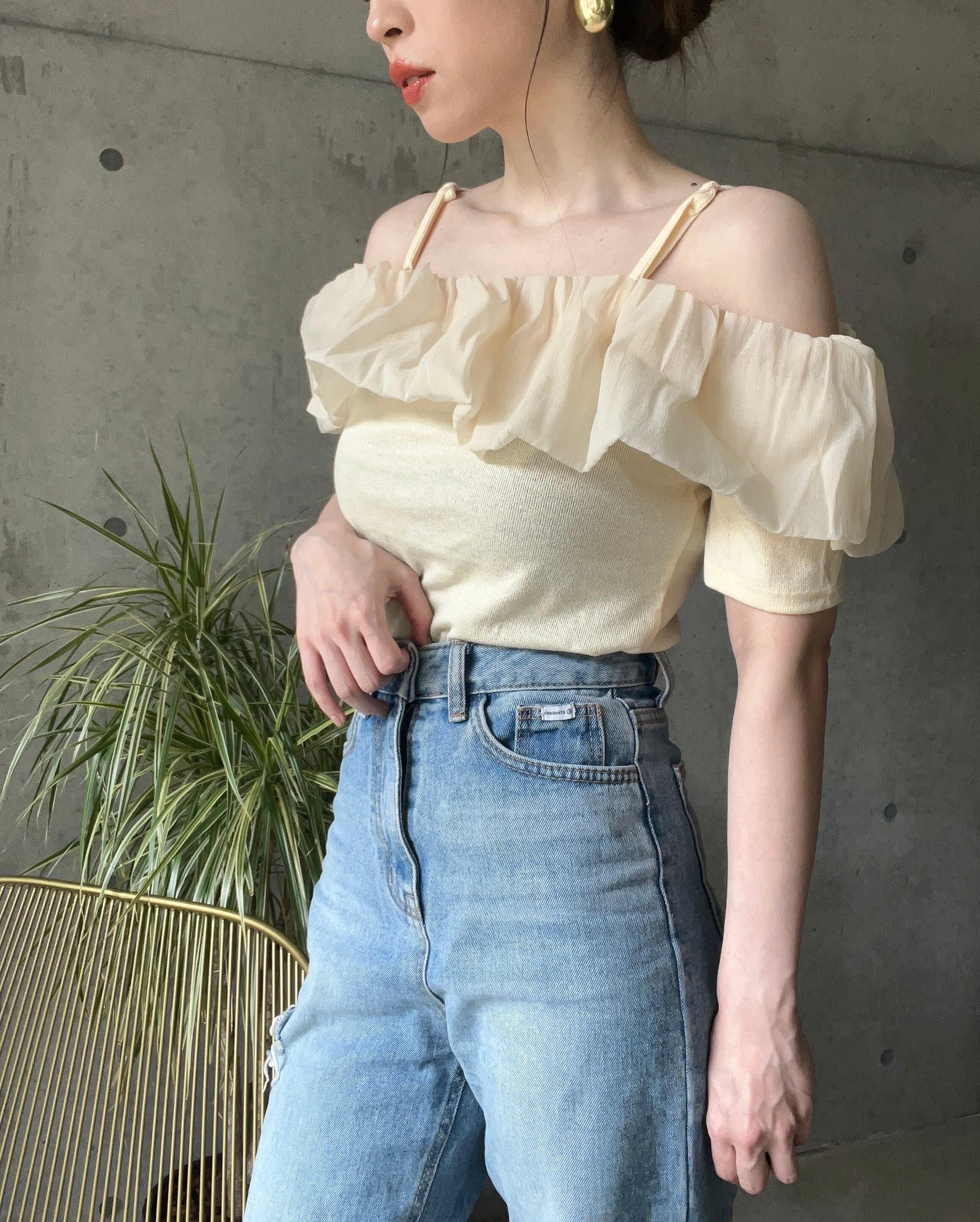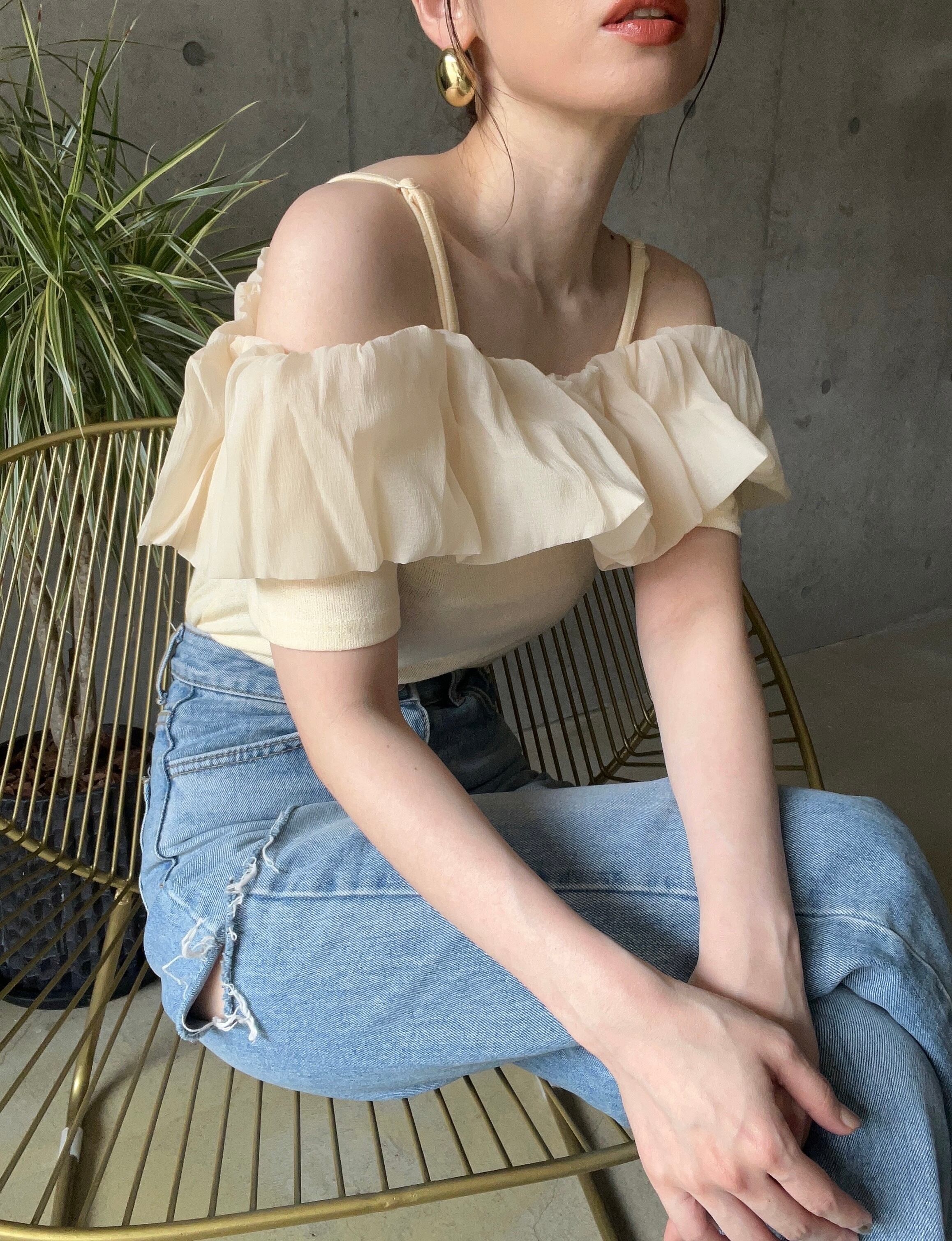 【即納】オフショルダーシフォンデザイントップス【アイボリー】