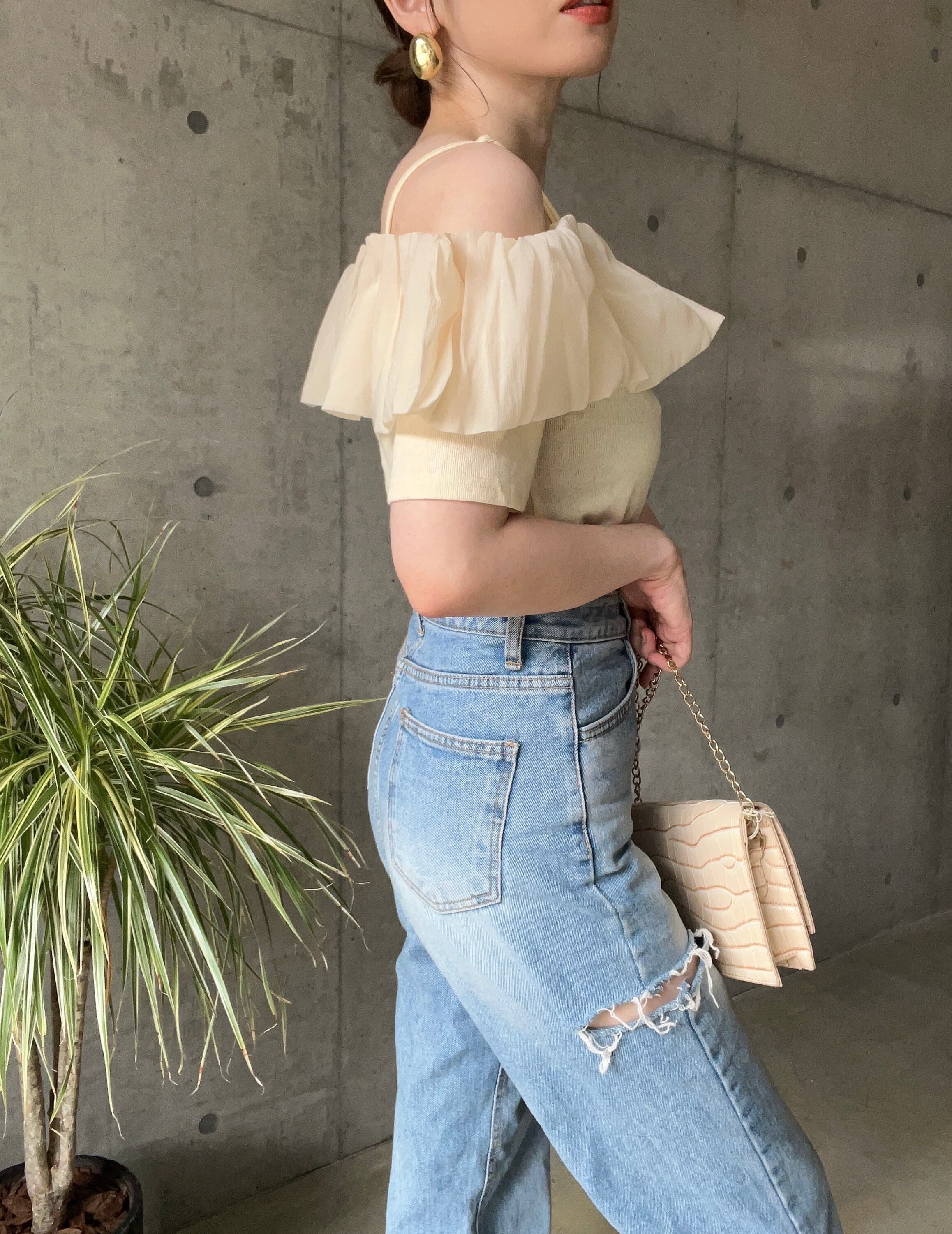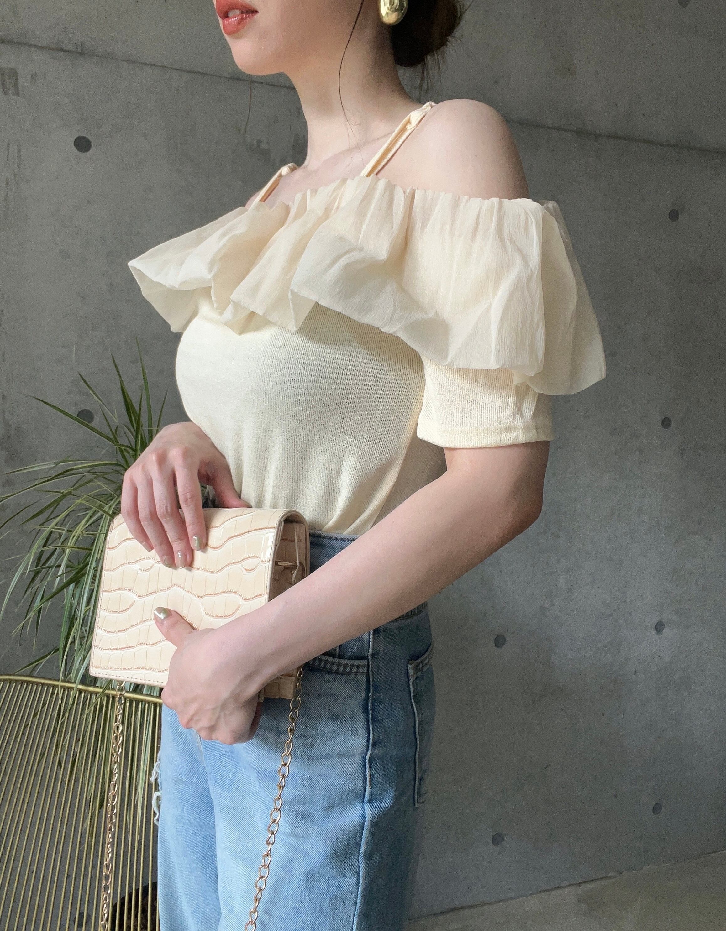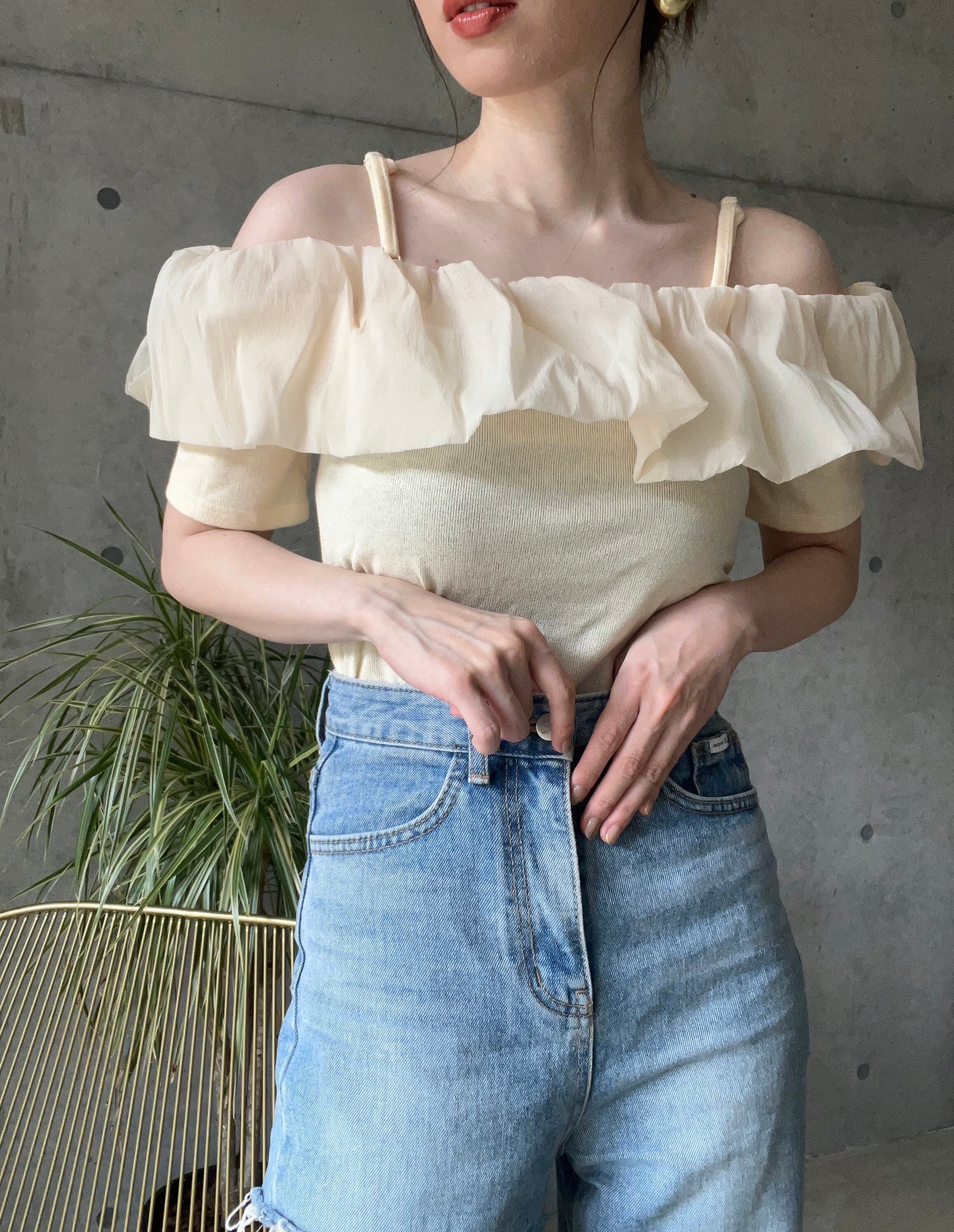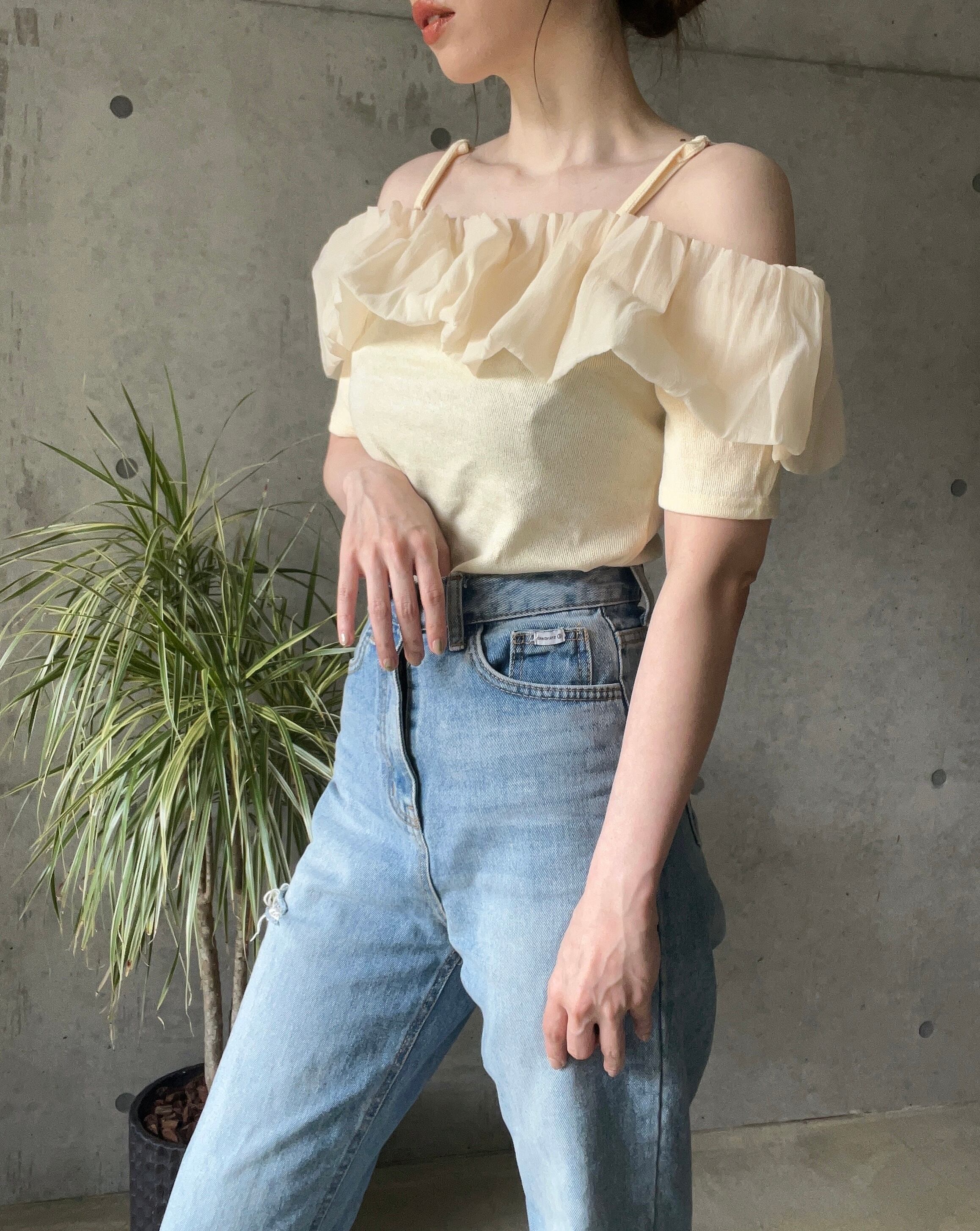 【即納】オフショルダーシフォンデザイントップス【アイボリー】