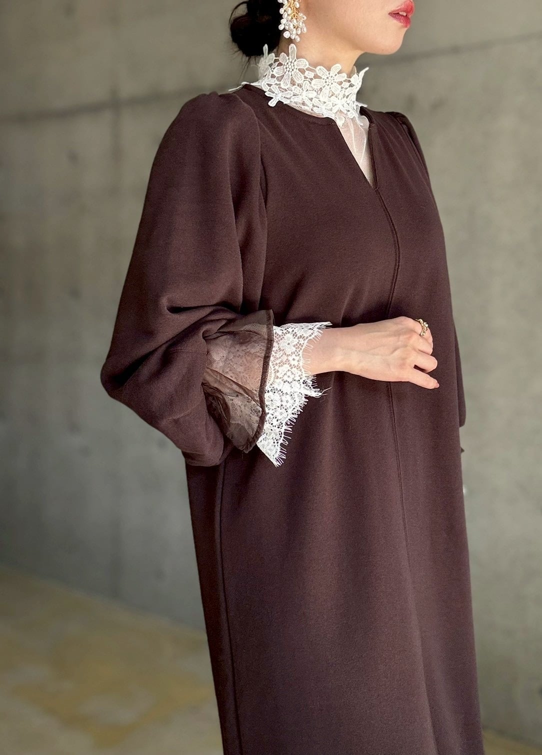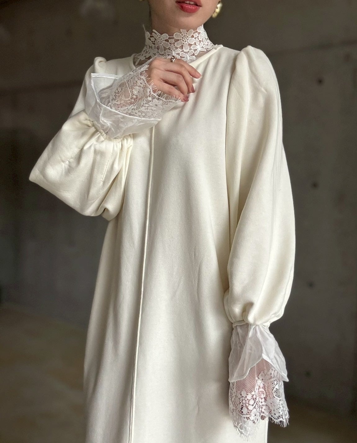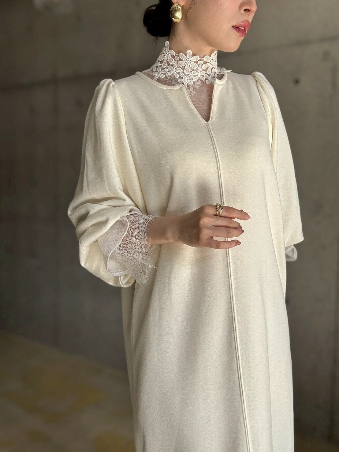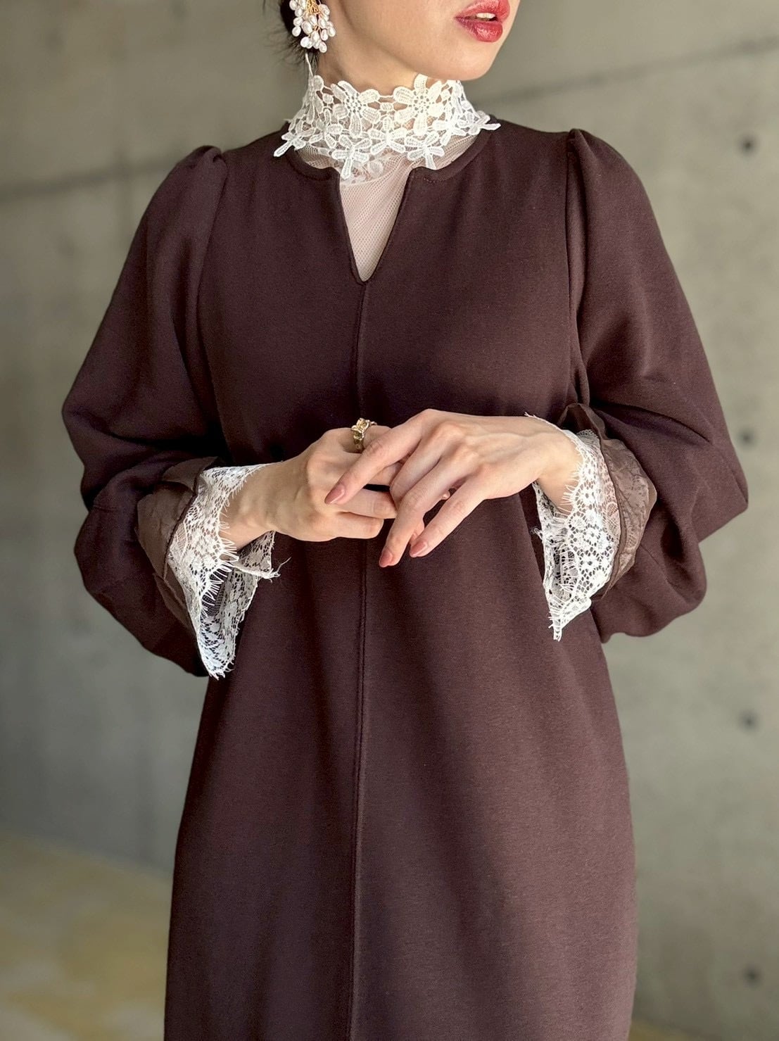 長めのキャンディスリーブや首元のしっかりめレースなど、細かなディテールがレイヤードにぴったり♡