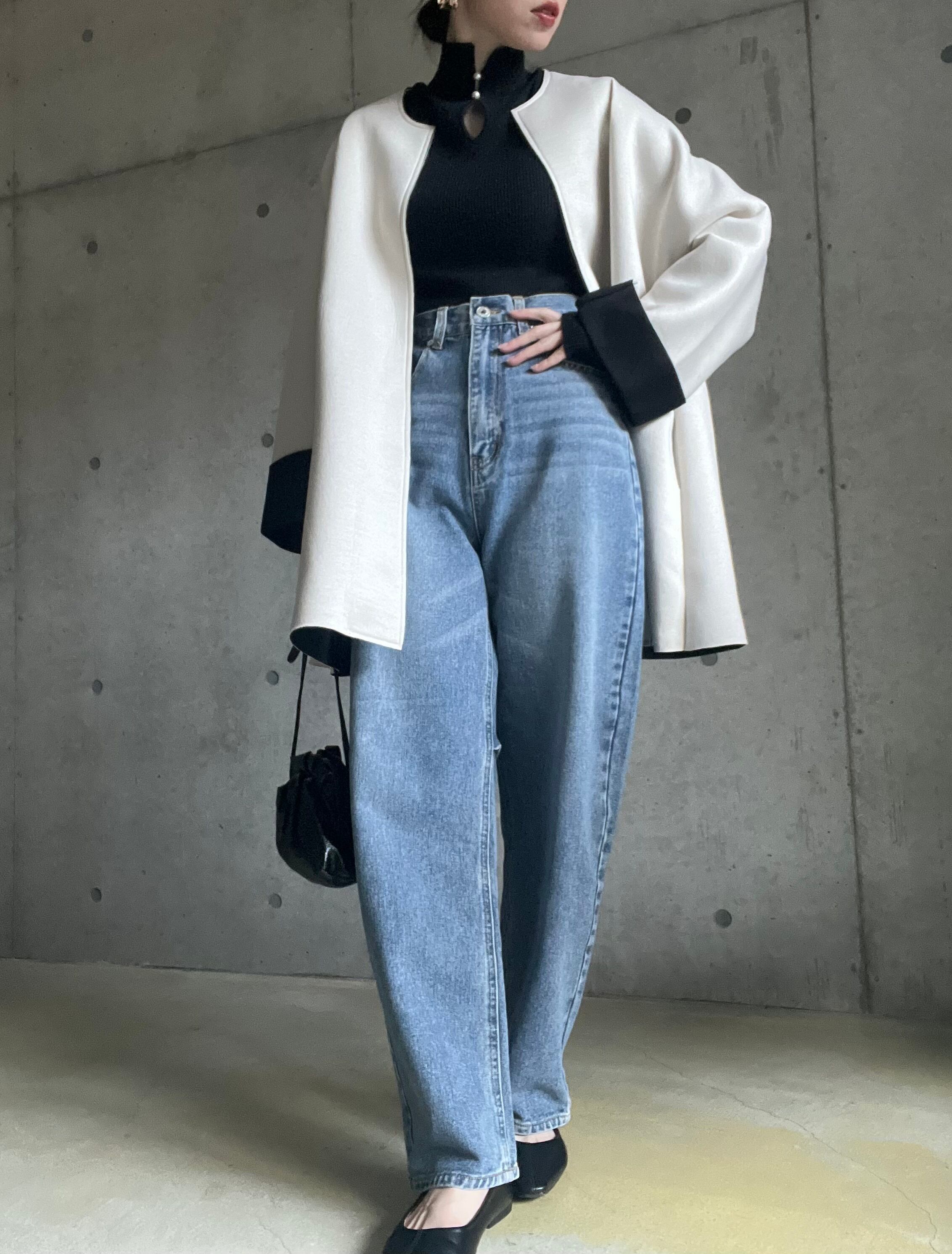 重心が下に置かれるので、トップスはコンパクトにショート丈やタイトめを合わせるのがオススメです✨