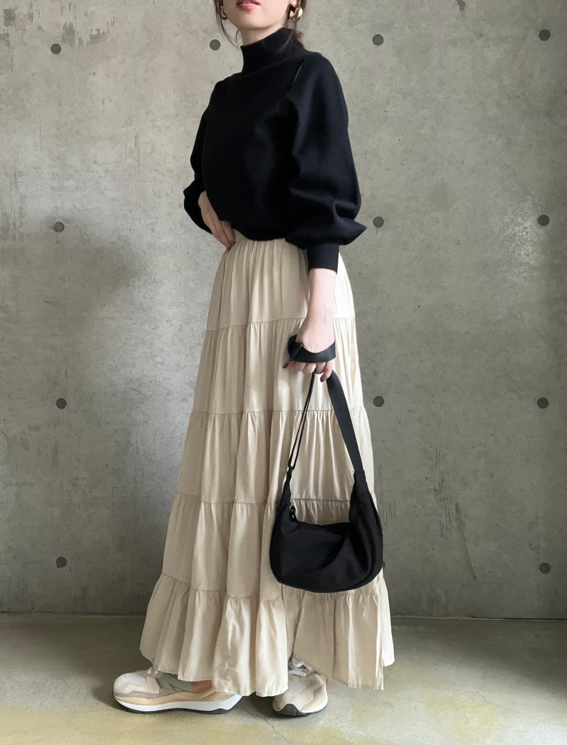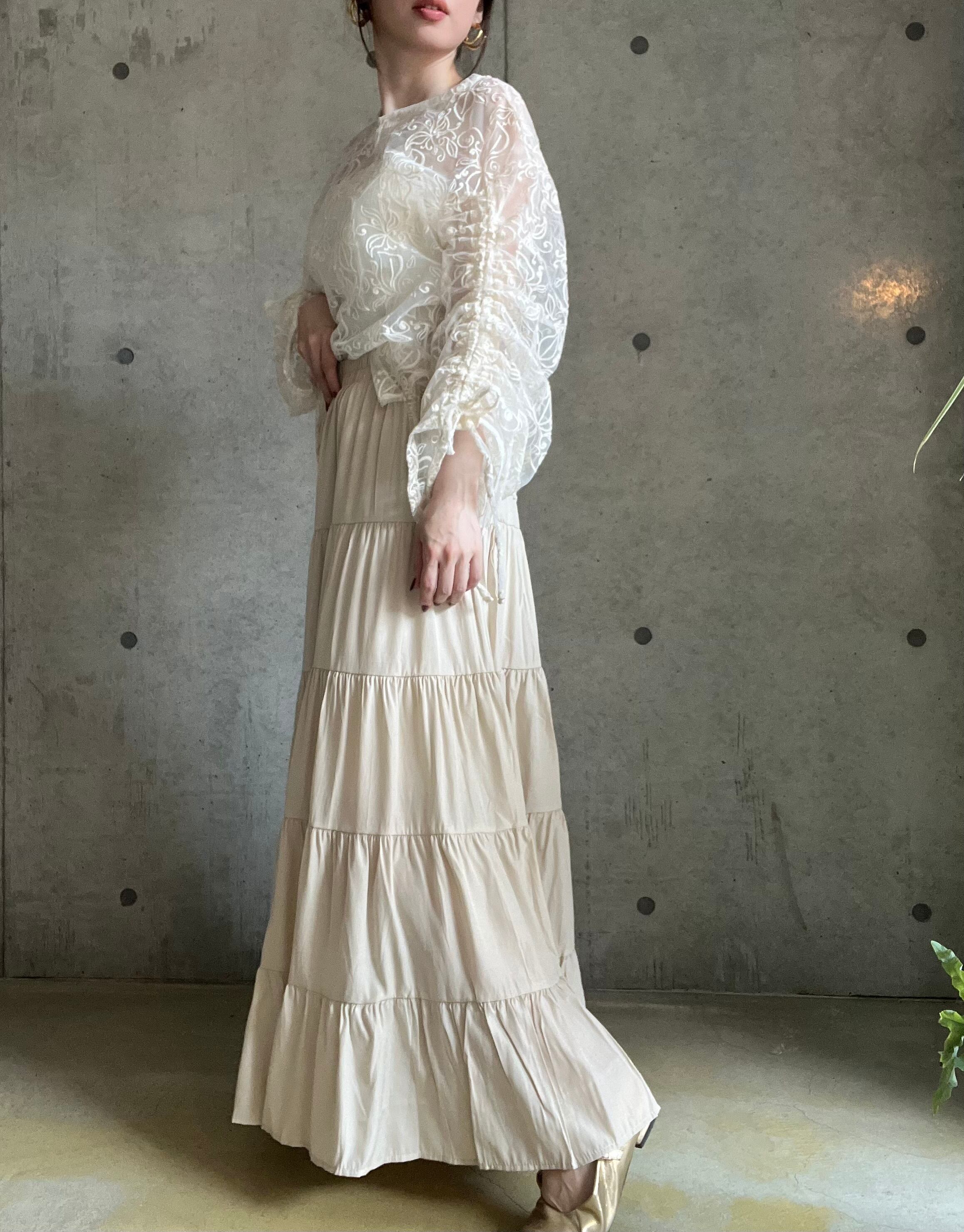 ふわっとエアリーな素材感がポイントのマキシ丈ティアードスカート✨