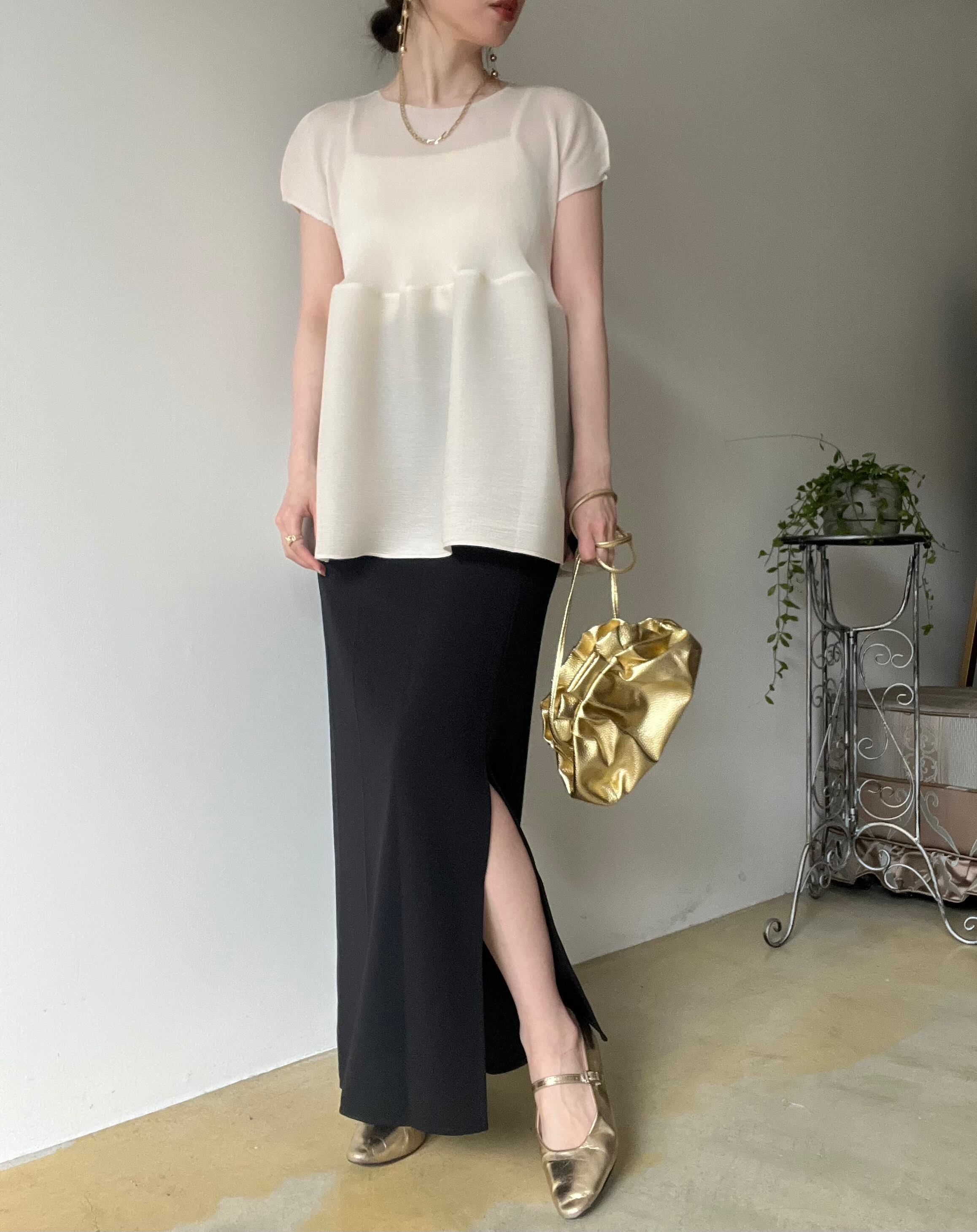 さり気ない光沢感と上品なペプラムシルエットが高級感のある印象に。
