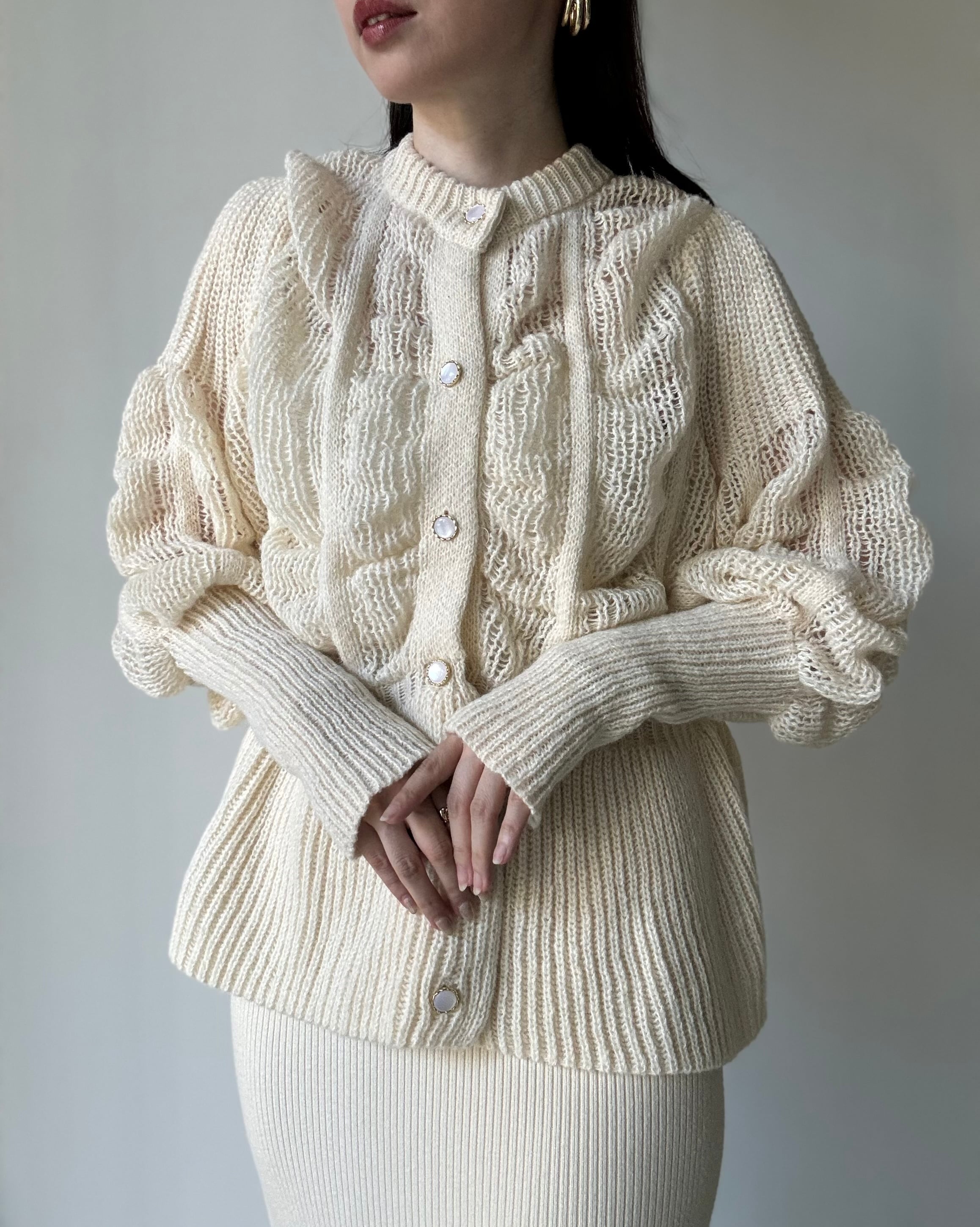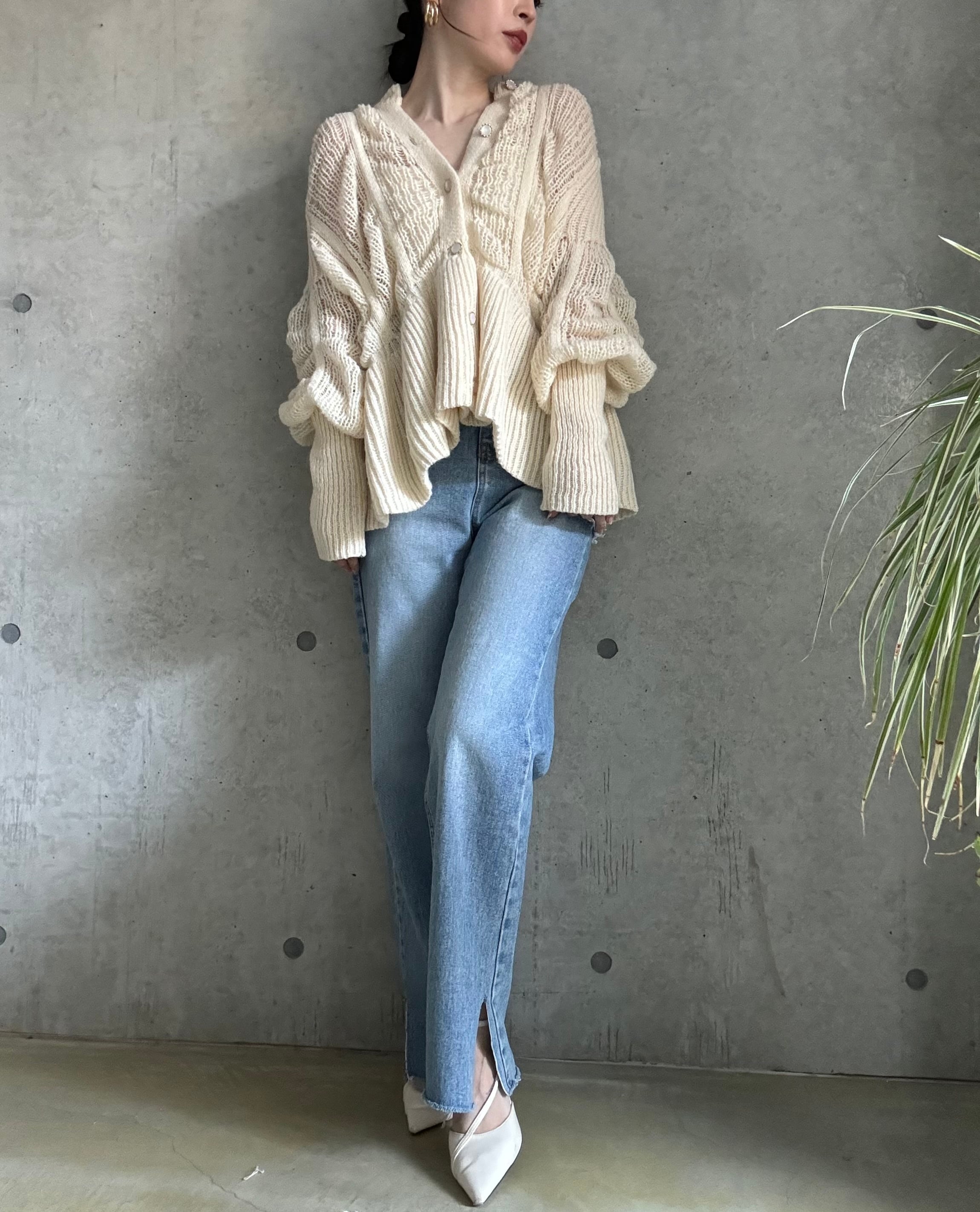 【即納】柄編みペプラムニットカーディガン【アイボリー】