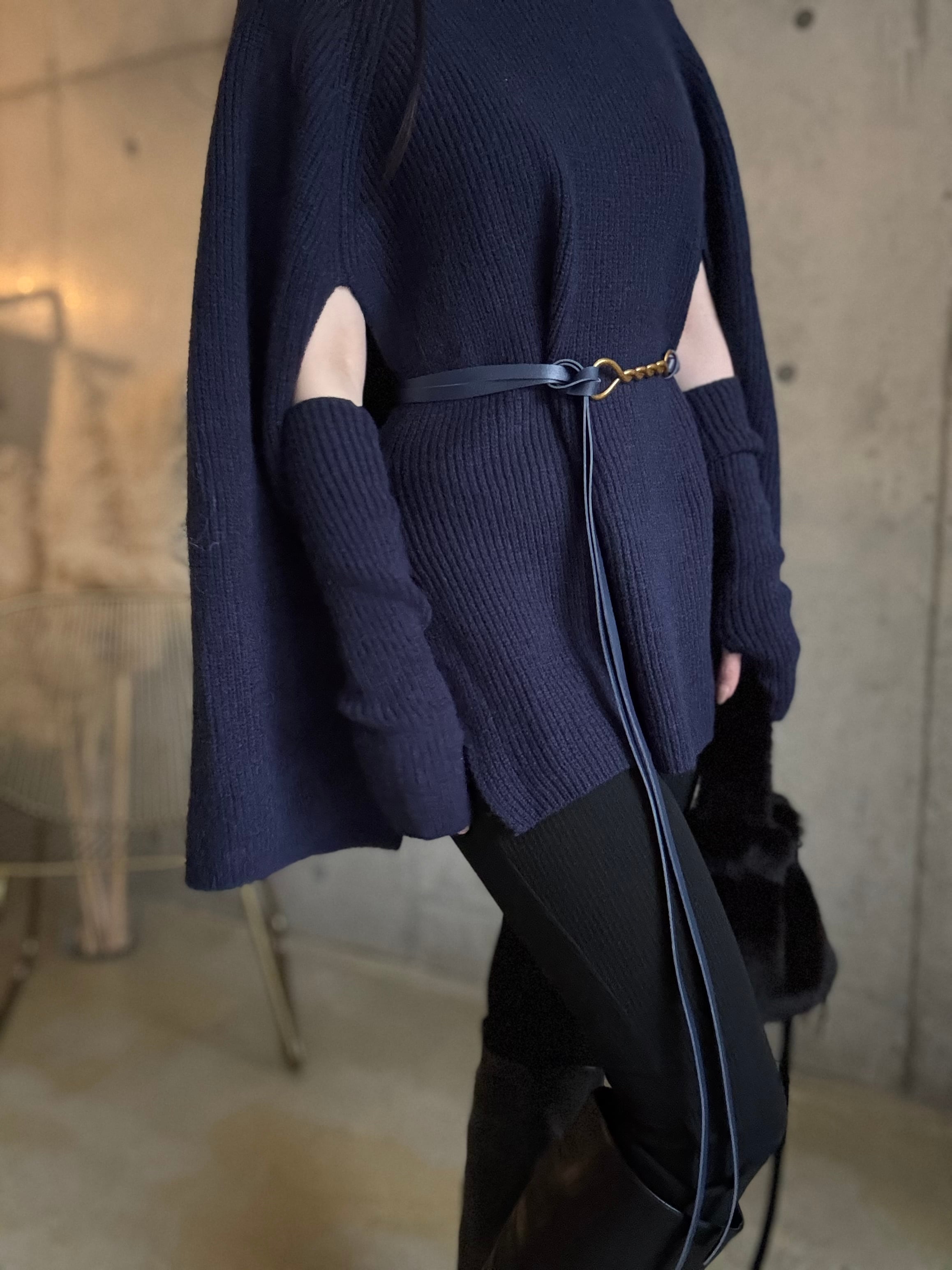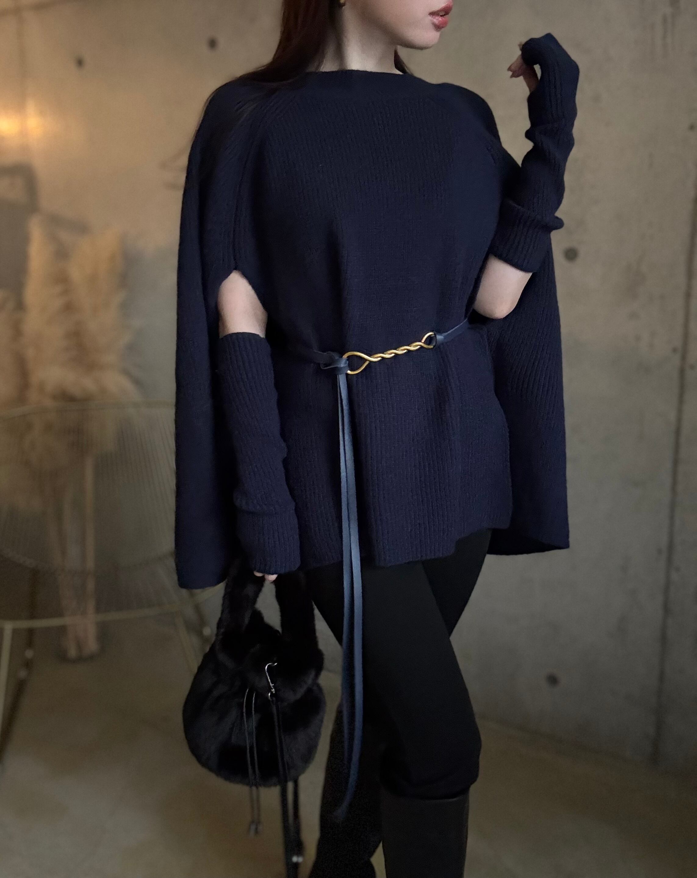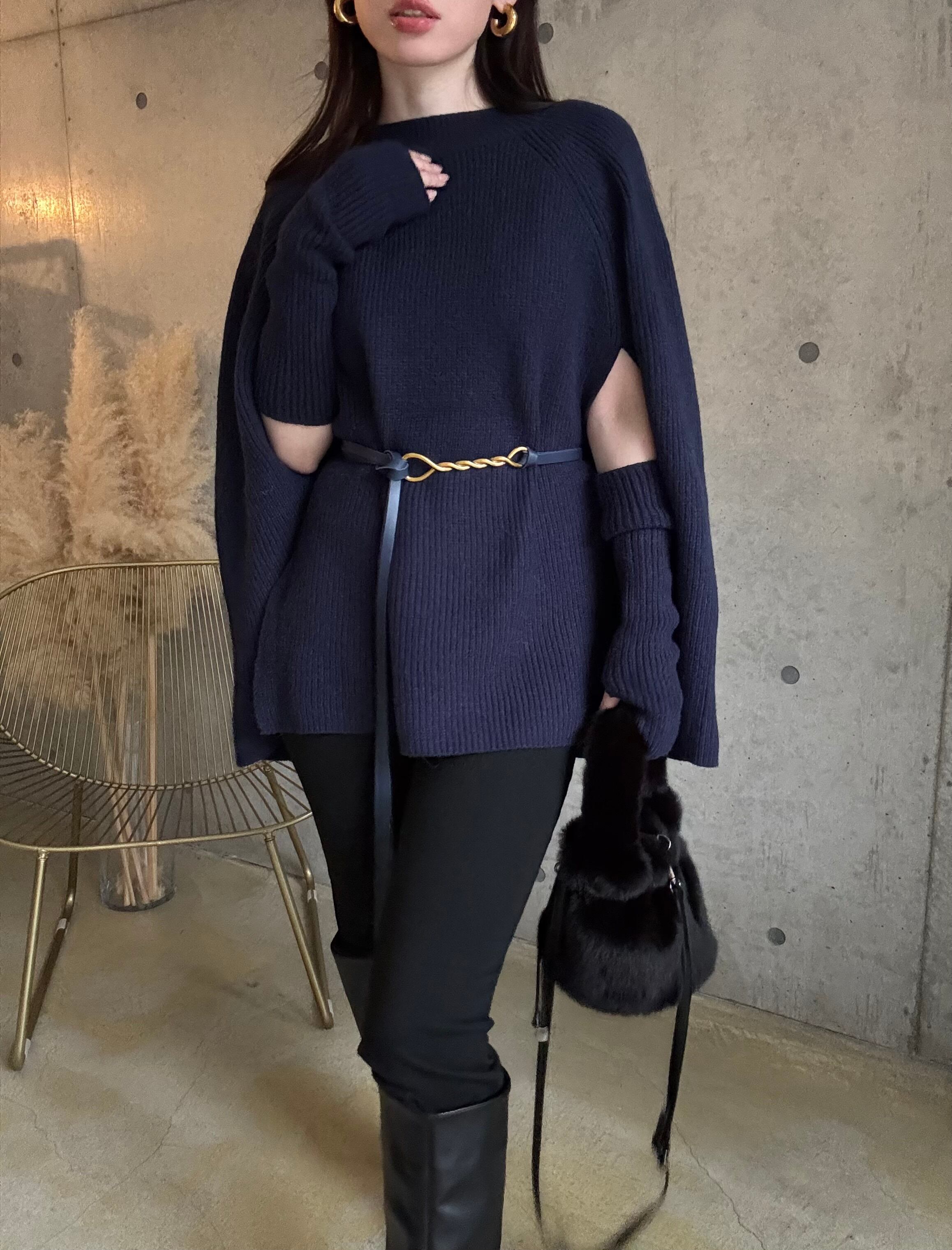 【即納】ケープ風ニット(アームウォーマー+ベルトset)【ネイビー】