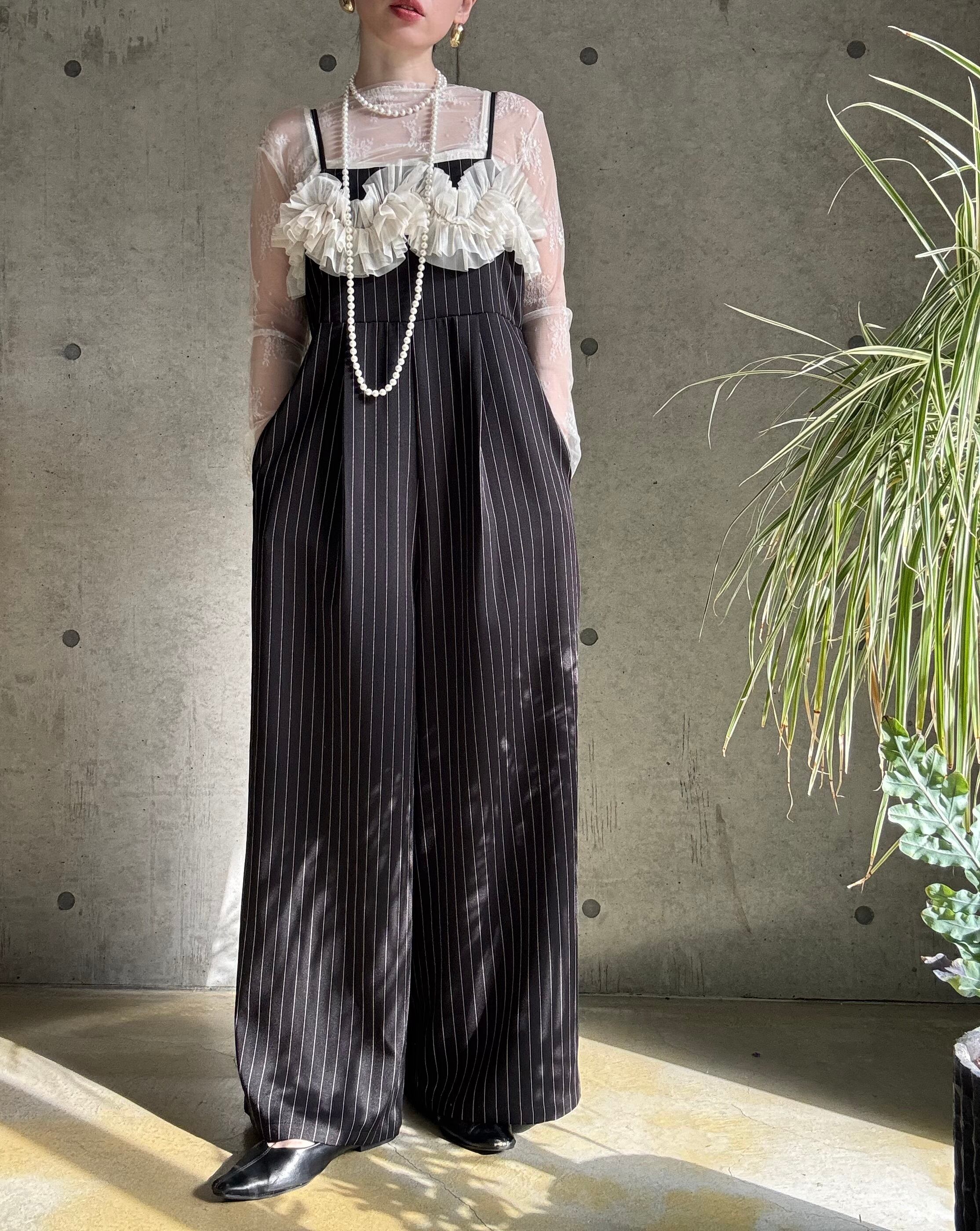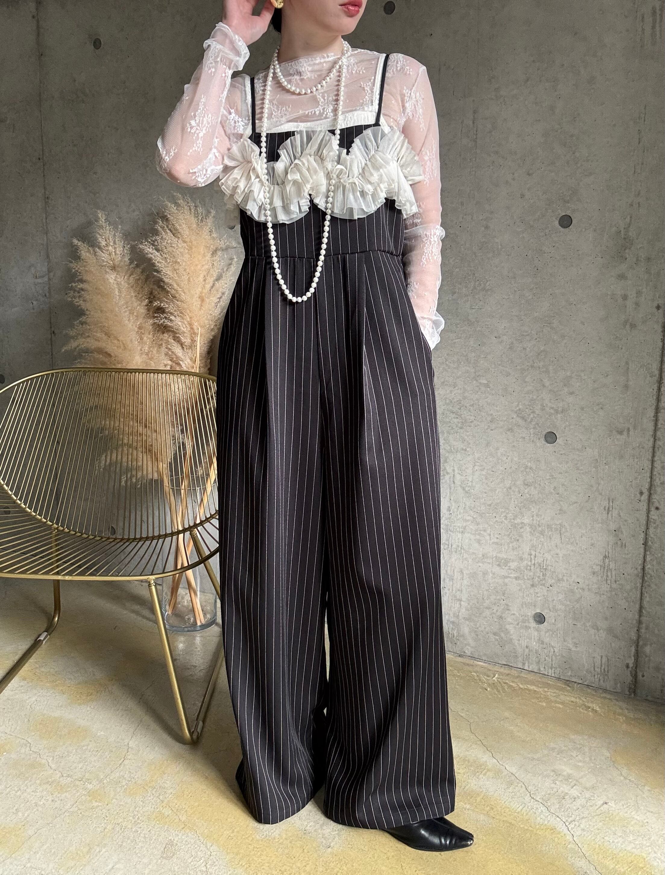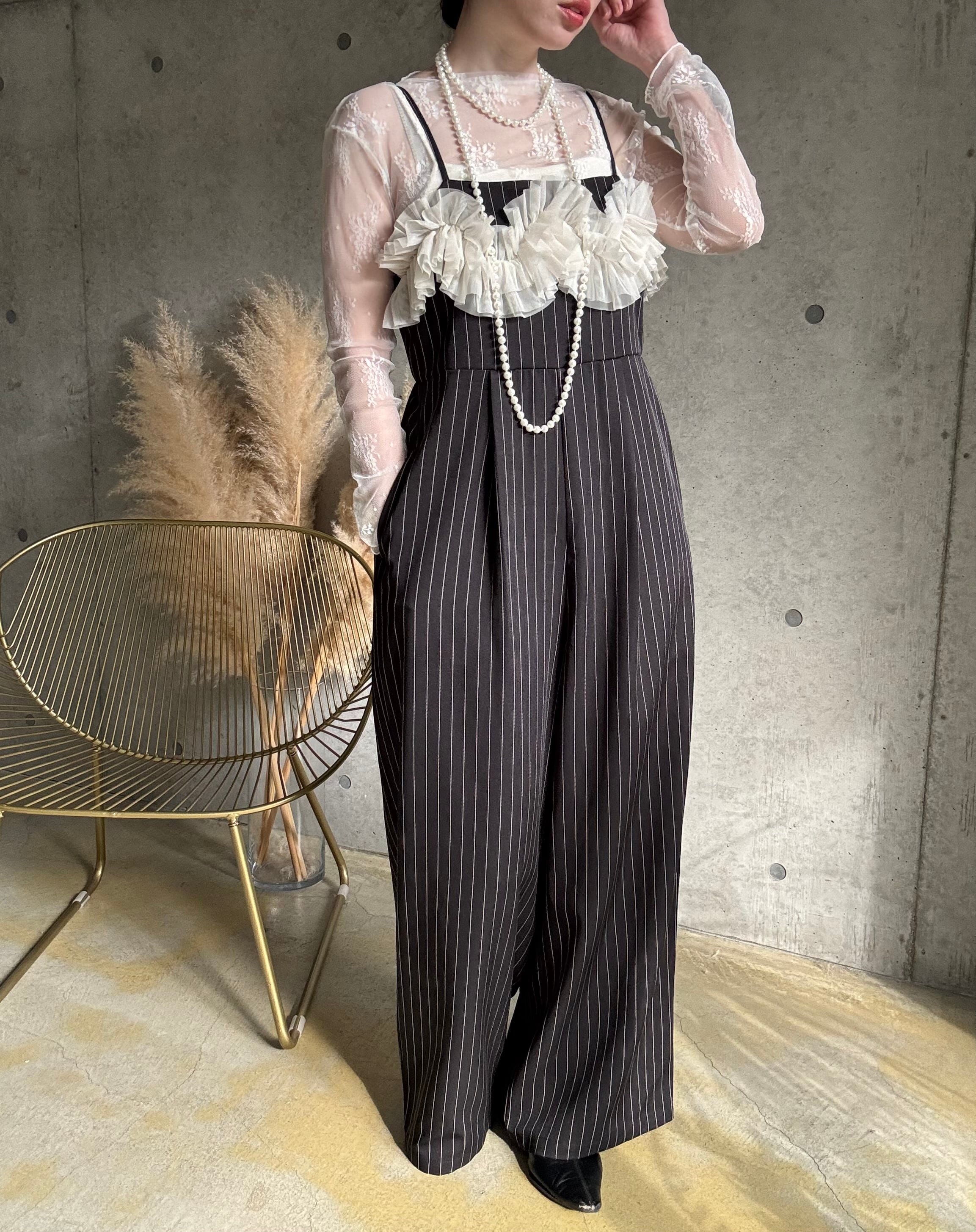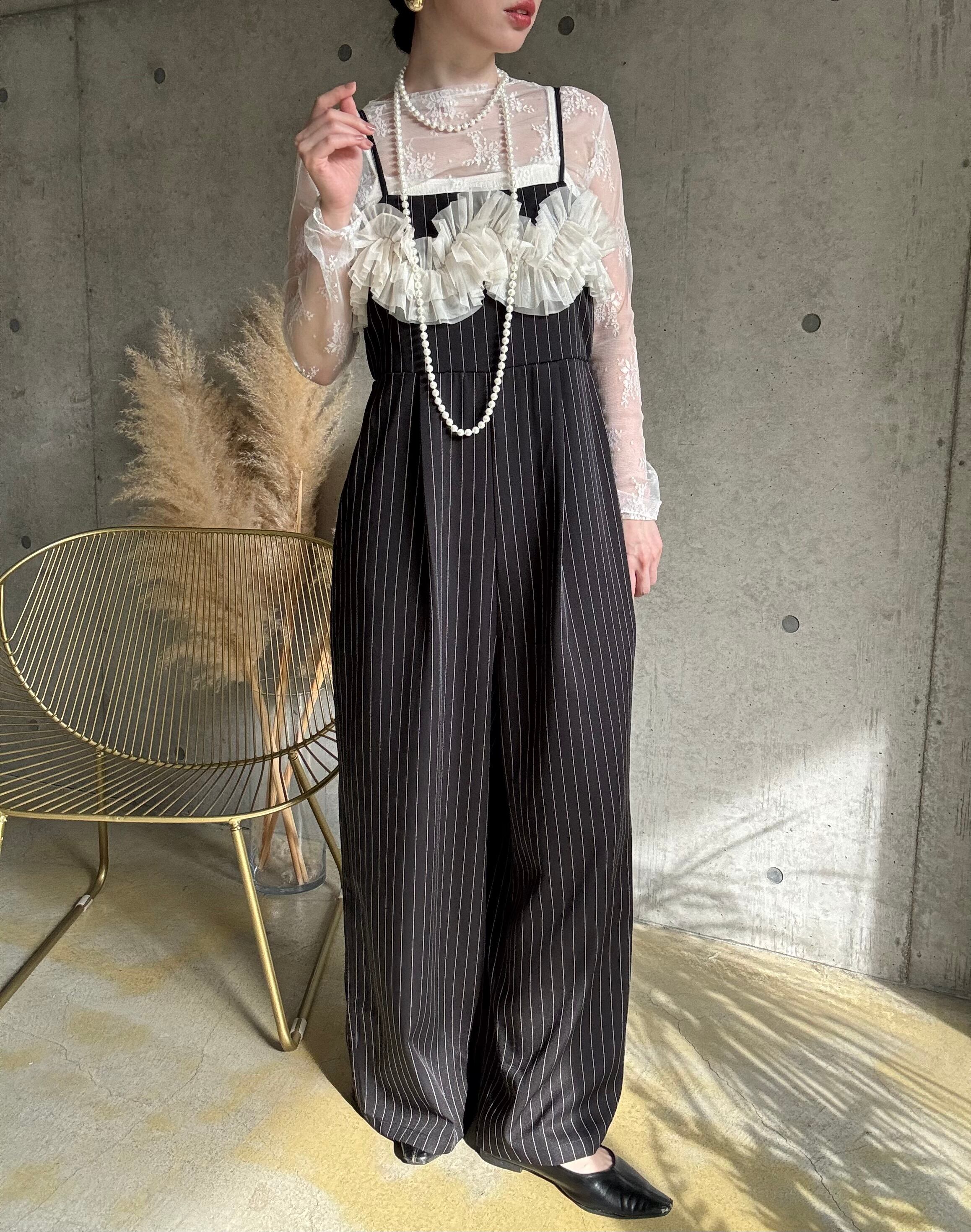 胸元のフリルが女性らしい華やかな印象のサロペット✨